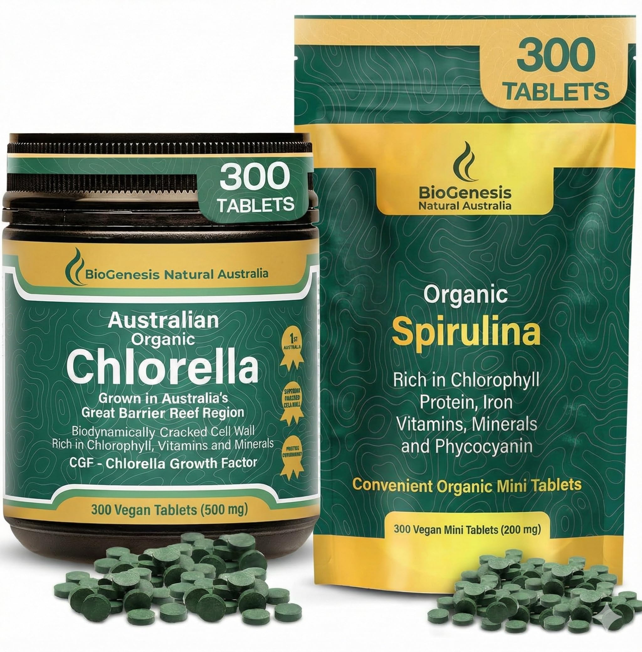 Unlock the Full Power of Australian Superfoods with the BioGenesis Energy Detox Bundle Revitalize your body from the inside out with the BioGenesis Organic Spirulina Chlorella Duo. We have paired our two most potent superfoods into one convenient bundle designed to cover your daily nutritional bases: Spirulina for energy and immunity, and Chlorella for detoxification and gut health. Why Choose the BioGenesis Bundle? 1. A Synergy of Energy Cleansing Stop choosing between energy and detox. Spirulina Mini Tabs (200mg): Rich in Phycocyanin—a rare antioxidant found only in Spirulina—this blue-green algae delivers a concentrated boost of plant-based protein and iron to fight fatigue and support daily vitality. Chlorella Tablets (500mg): Packed with Chlorophyll and Omega 3 6 9s, Chlorella acts as a natural magnet for toxins. It binds to heavy metals to aid liver function and digestion, leaving you feeling lighter, clearer, and more balanced. 2. The Only Certified Australian Grown Algae Most algae supplements are imported or grown in artificial, sugar-fed environments. BioGenesis is different. We cultivate our greens in the pristine heart of the Great Barrier Reef region. Using a patented hydrodynamic system that mimics natural river flow, our algae is nourished by pure Australian spring water and natural sunlight. The result? A cleaner, denser, and more potent superfood. 3. Bio-Dynamic Technology for Superior Absorption Nutrients are only good if your body can use them. We utilize a unique bio-dynamic pressure system to crack the algae's tough cell walls. Unlike competitors who use heat or chemicals that degrade nutrition, our gentle process preserves the delicate vitamins, enzymes, and antioxidants, ensuring you get maximum absorption in every dose. How to Use: Spirulina: Take 15 mini-tablets daily (easy to swallow!) to fuel your day. Chlorella: Take 6 tablets daily to support your body's natural cleansing processes. No mixing, no prep, no fuss100 AUSTRALIAN MADE, VEGAN TESTED: BioGenesis is the only certified "Australian Made Grown" algae brand. Our products are sustainably farmed, strictly lab-tested for heavy metals and safety, and free from pesticides, fillers, and binders. You get clean, traceable, whole-food nutrition that supports a healthy gut, liver function, and overall wellness. CONVENIENT DAILY NUTRITION – NO MESS, NO POWDERS: Skip the grassy-tasting powders and messy mixing. This bundle offers the ultimate convenience for busy lifestyles. The Spirulina Mini Tablets are tiny and easy to swallow, while the Chlorella Tablets provide a robust nutrient hit. Perfect for travel, work, or the gym—just take with water and go. MAXIMUM ABSORPTION WITH BIO-DYNAMIC CRACKING: We use a specialized "bio-dynamic pressure" process to gently crack the tough cell walls of the algae without the use of harsh heat or chemicals. This ensures the nutrients—including Vitamin B12 and Amino Acids—remain intact and are highly bioavailable, allowing your body to absorb the maximum benefit from every tablet. GROWN IN SUNLIGHT, NOT SUGAR-FED LABS: Unlike common algae grown in indoor bioreactors fed with sugar, our greens are cultivated in the pristine Great Barrier Reef region using a patented hydrodynamic system that mimics natural river flow. Powered by pure Australian spring water and sunshine, our algae develops naturally for superior nutrient density and unmatched purity. THE ULTIMATE AUSTRALIAN SUPERGREEN DUO: This bundle combines the energizing power of Spirulina (200mg Mini Tabs) with the detoxifying strength of Chlorella (500mg Tablets). Together, they deliver a complete profile of plant-based protein, iron, Chlorophyll, Phycocyanin, and Omegas to restore vitality, support immune health, and balance your nutrition naturally—without the caffeine crash.