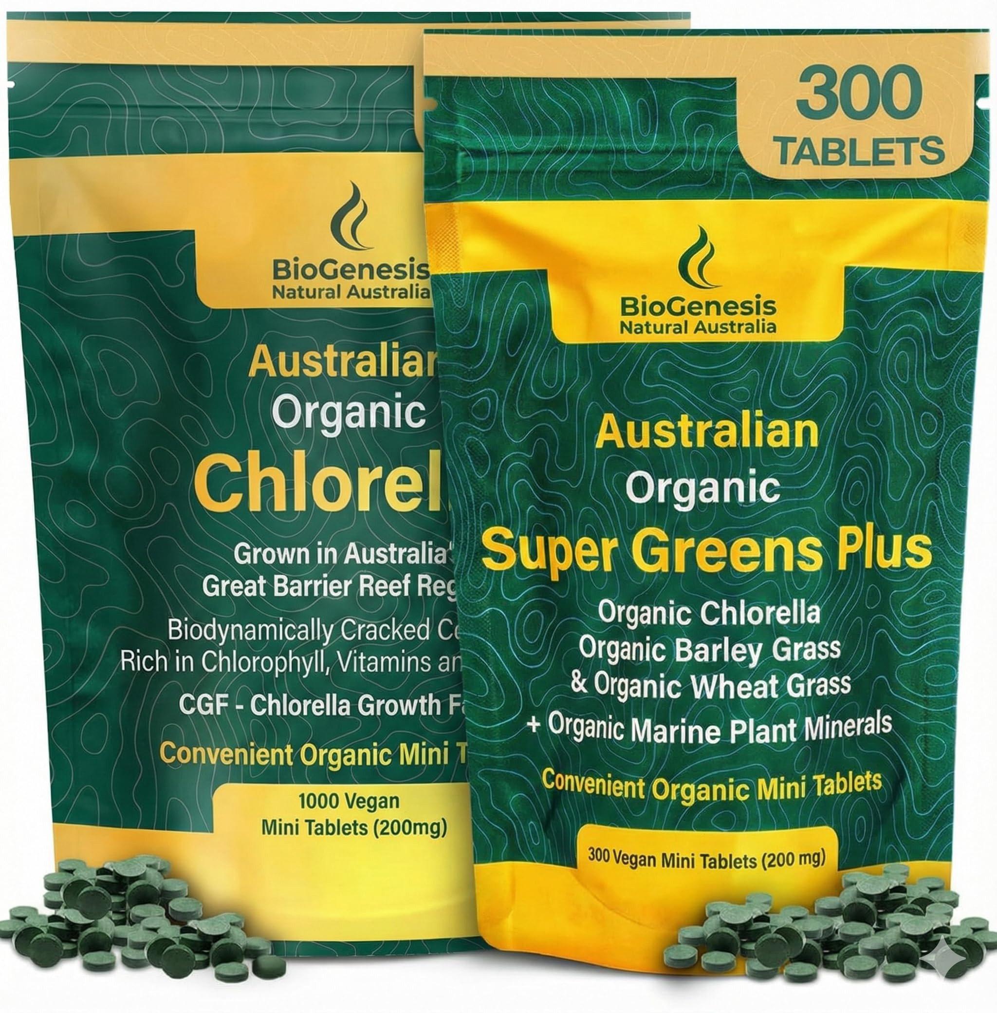 RESTORE VITALITY NATURALLY WITH THE BIOGENESIS "TOTAL GREENS" BUNDLE Are you feeling tired, run down, or simply looking to bridge the gap in your daily nutrition? The Biogenesis Australian Greens Bundle offers a powerful, two-step solution to restore your energy and cleanse your system. We have paired our best-selling Organic Chlorella (300 Ct) with our potent SuperGreens Plus (300 Ct) to give you 600 tablets of pure, plant-based power. Step 1: The Power of Organic Chlorella (500mg) Our Chlorella is nature's multi-vitamin. Packed with 50 plant-based protein, iron, and essential B12, it is designed to support immune health and bind to heavy metals, aiding in natural detoxification. It helps you feel lighter and clearer by supporting liver function and digestion. Step 2: The Foundational SuperGreens Plus Blend (200mg) While other brands overpromise with buzzwords, our SuperGreens Plus focuses on the four greens that truly matter: Organic Chlorella, Barley Grass, Wheatgrass, and Spirulina. This blend delivers deep alkalizing nutrition and sustained energy without stimulants or synthetic additives. Why Choose BioGenesis? No Mixing, No Mess: Skip the shaker bottle. These tablets fit effortlessly into your routine, offering a clean way to get your greens even when you are on the go. Patented Growing System: We grow our greens in pristine Australian spring water using a hydrodynamic system that mimics natural river flow. Powered by sunlight—not sugar-fed tanks—our greens develop superior nutrient density. BioDynamic Absorption: We use a gentle, pressure-based system to crack the cell walls of our Chlorella. This ensures you absorb the maximum amount of Chlorophyll and nutrients without the use of heat or harsh chemicals. Certified Australian Grown: Sustainably cultivated in the Great Barrier Reef region, our products are lab-tested and completely free from pesticides and fillers. Experience the difference of Australian-grown purity. Cleanse, reset, and nourishCERTIFIED AUSTRALIAN GROWN SUSTAINABLE: Trust the source. BioGenesis is the only certified "Australian Made Grown" Chlorella brand. Sustainably farmed in the Great Barrier Reef region and lab-tested for safety, our tablets are strictly free from pesticides, fillers, and binders. This is pure, traceable superfood quality from source to bottle. FOUNDATIONAL NUTRITION WITHOUT THE FLUFF: Forget complex powders and messy mixing. This bundle offers "No-Prep" nutrition. You get the foundational greens that matter—Organic Chlorella, Barley Grass, Wheatgrass, and Spirulina—in easy-to-swallow tablets. Perfect for travel or busy mornings, simply take your daily dose with water for a clean, consistent nutrient boost. PATENTED "SUN-GROWN" HYDRODYNAMIC PURITY: Unlike common algae grown in sugar-fed bioreactors, our greens are cultivated in pristine Australian spring water using a patented system that mimics natural river flow. We use BioDynamic pressure—no heat or chemicals—to crack the cell walls, unlocking maximum absorption of chlorophyll and amino acids. DEEP DETOX DIGESTIVE RESET: Cleanse and nourish from the inside out. The Chlorella naturally binds to heavy metals and toxins to aid liver function, while the SuperGreens blend (Chlorella, Barley Grass, Wheatgrass, Spirulina) supports digestive balance. Feel lighter, clearer, and less bloated with a daily regimen that works synergistically to reset your gut. ULTIMATE AUSTRALIAN GREEN ENERGY STACK: This 600-tablet bundle combines pure Organic Chlorella (500mg) with the SuperGreens Plus blend (200mg) to naturally combat fatigue. Packed with 50 plant-based protein, Vitamin B12, Iron, and Omega 3 6 9s, this duo delivers deep nutrition to support sustained energy, immune health, and overall well-being without the caffeine crash.