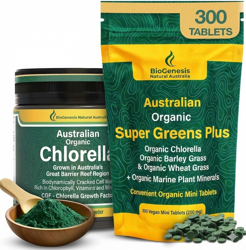 Experience the Power of Pure Australian Superfoods Unlock your body's potential with the Biogenesis Ultimate Greens Bundle, a curated pairing of our premium Organic Chlorella Powder (200g) and SuperGreens Plus Tablets (300 Count). We believe in foundational nutrition without the fluff—just pure, potent greens grown under the Australian sun. 1. Organic Chlorella Powder: The Smoothie Supercharger Cleanse, reset, and nourish from the inside out. Our Chlorella powder is a nutrient-dense powerhouse containing 50 plant-based protein, essential Vitamin B12, Iron, and Omega fatty acids. Detox Naturally: Chlorella binds to toxins and heavy metals, supporting liver health and digestion. Customizable Nutrition: This powder has an earthy, natural profile. Blend it into your morning smoothie with fruit, mix it with apple juice, or stir it into water for a bio-available boost that leaves you feeling lighter and more balanced. 2. SuperGreens Plus Tablets: Nutrition on the Go Tired, run down, or need a boost while traveling? Our SuperGreens Plus tablets are the solution. We have combined Organic Chlorella, Wheatgrass, and Barley Grass into mini-tablets that fit effortlessly into your routine. No Prep Required: Forget the shaker bottle. Take your greens with or without food for a clean, consistent energy lift. Foundational Wellness: This blend delivers deep nutrition to support immune health and energy without stimulants or synthetic additives. The Biogenesis Difference: Nature Science We don't cut corners. While other brands use indoor bioreactors fed with sugar, we grow our greens in pristine Australian spring water in the Great Barrier Reef region. Patented Hydrodynamic System: Our unique growing method mimics natural river flow, ensuring our algae is exercised and nutrient-dense. BioDynamic Cell Cracking: We use pressure—not heat or chemicals—to crack the cell walls. This ensures the Chlorophyll, B12, and amino acids remain intact and are easily absorbed by youCERTIFIED AUSTRALIAN GROWN VEGAN – Biogenesis is the only certified "Australian Made Grown" producer of these superfoods. Sustainably farmed in the Great Barrier Reef region and lab-tested for safety, our products are 100 Vegan, Non-GMO, and free from pesticides and fillers. Clean, traceable nutrition from source to scoop. PATENTED "RIVER FLOW" GROWING SYSTEM – Unlike conventional algae grown in sugar-fed bioreactors, our greens are cultivated in pristine Australian spring water using a patented hydrodynamic system that mimics natural river flow. Powered by natural sunlight, our greens develop superior nutrient density and purity, free from heavy processing or synthetic additives. CONVENIENT SUPERGREENS TABLETS – Get your foundational greens without the hassle. These easy-to-swallow mini tablets combine Chlorella, Barley Grass, and Wheatgrass into a powerhouse blend. Perfect for busy days, they require no prep or mixing—simply take them with water to support digestion, immunity, and sustained energy levels wherever you are. PURE CHLORELLA POWDER FOR DETOX VITALITY – Our BioDynamic Chlorella powder is packed with 50 plant-based protein, Vitamin B12, Iron, and Omega 3 6 9. It naturally binds to heavy metals to aid detoxification and supports liver function. With a cracked cell wall for maximum absorption, this powder is perfect for mixing into juices or smoothies to restore vitality naturally. ULTIMATE AUSTRALIAN SUPERFOOD DUO – This comprehensive bundle includes 200g of Organic Chlorella Powder for nutrient-dense smoothies and 300 SuperGreens Plus Mini Tablets for convenient nutrition on the go.