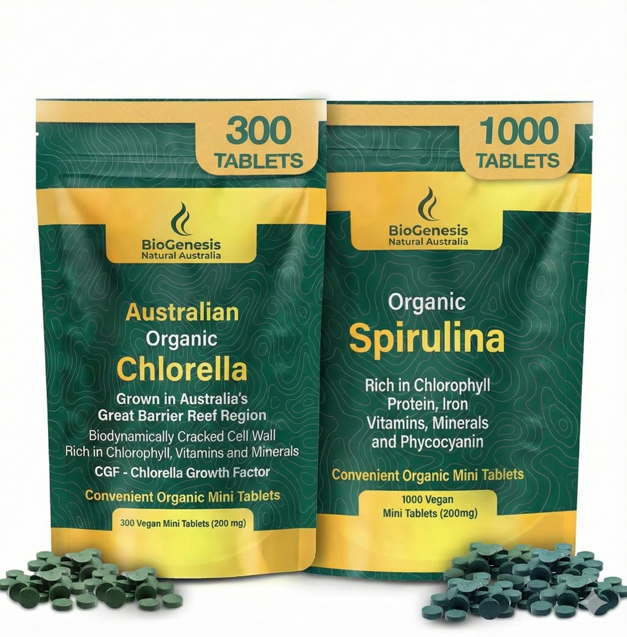 Restore Vitality and Cleanse Your Body with the Power of Australian Supergreens Unlock the full potential of nature's most potent superfoods with the Biogenesis Organic Supergreens Bundle. This power-packed duo combines the energizing properties of Spirulina with the detoxifying benefits of Chlorella, delivering a complete nutritional foundation for your daily life. Why Choose the Biogenesis Bundle? The Energy Specialist (Spirulina): Packed with Phycocyanin—a rare antioxidant found only in blue-green algae—our Spirulina delivers concentrated plant-based protein and iron to fight fatigue and support sustained energy without the crash. The Detox Expert (Chlorella): Known as nature's cleanser, Chlorella binds to toxins and heavy metals to support liver function and digestion. It helps you reset from the inside out, leaving you feeling lighter and more balanced. The Australian Difference: Clean, Pure, and Potent Most commercial algae is grown in artificial, sugar-fed tanks or sourced from polluted regions. BioGenesis is different. We are the only certified "Australian Made Grown" brand, cultivating our greens in the pristine spring water of the Great Barrier Reef region. Using a patented hydrodynamic system, we mimic natural river flow and rely on pure sunlight to grow our algae. This results in higher chlorophyll content and nutrient density compared to conventional methods. Maximum Bioavailability Nutrients are useless if your body can't absorb them. We use a unique biodynamic pressure process to crack the cell walls of our algae without using heat or chemicals. This preserves the delicate vitamins (like B12), enzymes, and amino acids while making them instantly bioavailable to your system. Bundle Includes: 1x Bottle Organic Spirulina Mini Tablets (1000 Count) 1x Bottle Organic Chlorella Mini Tablets (300 Count) Suggested Use: Take tablets daily with water, with or without food. Enjoy the convenience of premium greens without the hassle of mixing powders.EASY-TO-SWALLOW MINI TABLETS: Skip the messy powders and bad taste. These unflavored mini tablets are convenient for travel and busy lifestyles. Simply take your daily dose with water—no mixing or prep required. It is the hassle-free way to get your daily servings of greens, clean protein, and essential minerals. MAXIMUM ABSORPTION TECHNOLOGY: We use a biodynamic pressure method (no heat or harsh chemicals) to gently crack the tough cell walls of the algae. This unlocks the bioavailable nutrients inside—including plant-based protein and B12—ensuring your body can actually absorb and utilize the superfood benefits immediately. CERTIFIED AUSTRALIAN GROWN TESTED: Sourced from the Great Barrier Reef region, BioGenesis is the only certified "Australian Made Grown" brand for these algae. Our crops are sustainably farmed without pesticides, herbicides, or fillers. Every batch is lab-tested for heavy metals and purity, giving you traceable, clean nutrition you can trust. PATENTED "SUN-GROWN" PURITY: Unlike common algae grown in dark sugar-fed bioreactors, our greens are cultivated in pristine Australian spring water using a patented hydrodynamic system that mimics natural river flow. This sunlight-powered process ensures superior nutrient density, delivering pure Chlorophyll, B Vitamins, and Omega 3 6 9 fatty acids as nature intended. THE ULTIMATE AUSTRALIAN SUPERGREEN DUO: This bundle combines 1000 Spirulina mini tabs and 300 Chlorella mini tabs for a complete daily wellness routine. Spirulina provides a potent boost of Phycocyanin and Iron for energy, while Chlorella acts as a gentle detoxifier to bind heavy metals and aid digestion. Together, they offer comprehensive support for immunity, vitality, and gut health.