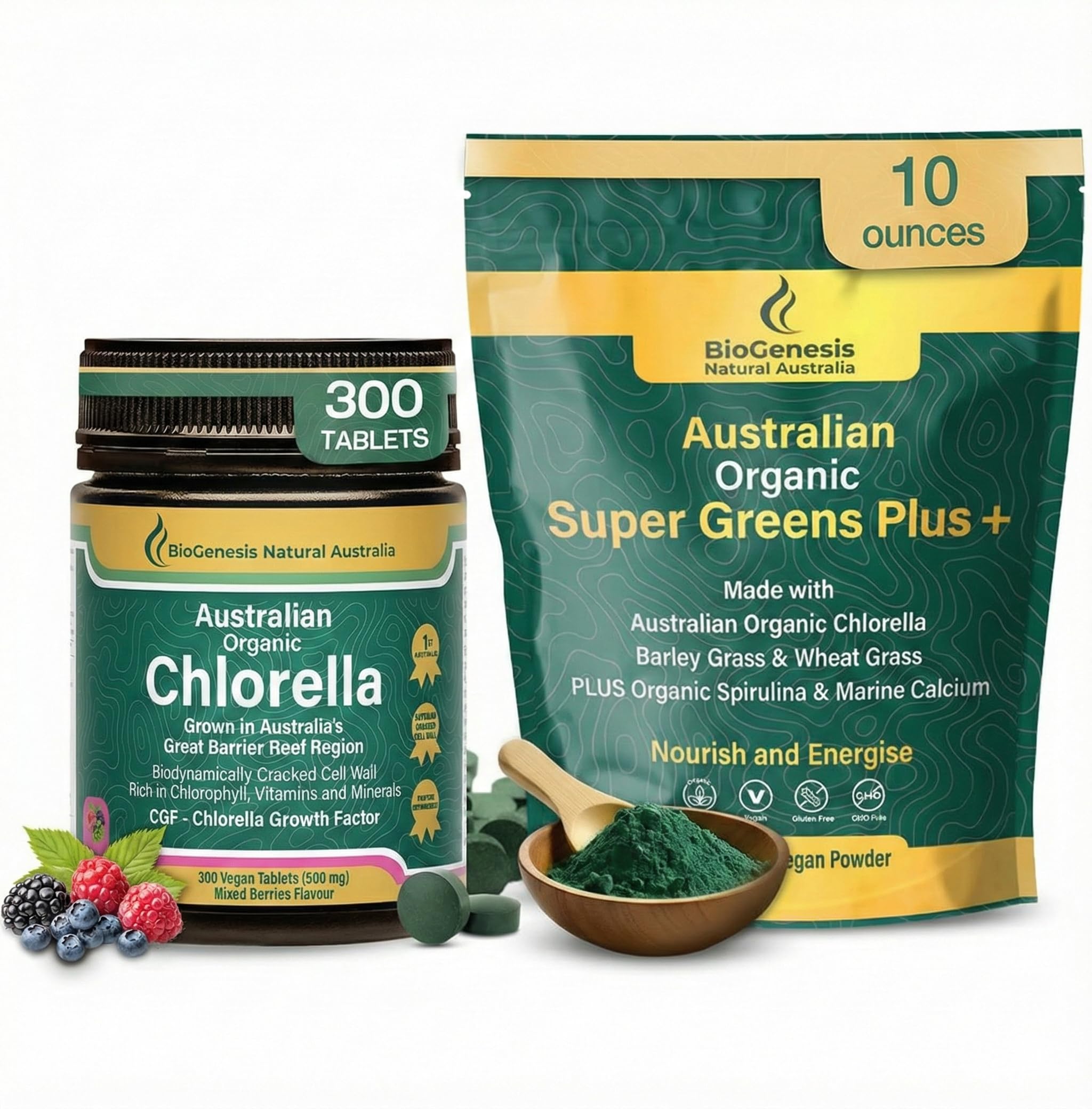 Unlock Your Body's Potential with the Biogenesis Ultimate Greens Stack Modern life is demanding. Whether you are battling fatigue, looking to reset your gut health, or simply striving for cleaner nutrition, the Biogenesis Australian Greens Bundle delivers the foundational support your body craves. We have paired our best-selling Organic Chlorella Tablets (Mixed Berry) with our powerhouse SuperGreens Plus Powder to create a comprehensive wellness system that works as hard as you do. Why Choose the Biogenesis Bundle? 1. The Power of Pure Australian Origin Most greens on the market are sourced from overseas facilities that use sugar-fed bioreactors. Not us. We grow our superfoods in the pristine spring waters of the Great Barrier Reef region. Our patented hydrodynamic system mimics the natural flow of a river, allowing our algae to grow under natural sunlight. The result? Superior purity and higher nutrient density. 2. Maximum Absorption (BioDynamic Technology) Greens are only good if your body can use them. We utilize a specialized BioDynamic cracked cell wall process that uses pressure—never heat or harsh chemicals—to gently open the algae cell walls. This preserves the delicate vitamins and enzymes while ensuring you absorb the Chlorophyll, Vitamin B12, Iron, and Amino Acids. 3. Two Formats, One Complete Routine At Home (SuperGreens Plus Powder): The Blend: A no-nonsense mix of Chlorella, Barley Grass, Wheatgrass, and Spirulina. The Use: Perfect for your morning ritual. It has an earthy, natural flavor that pairs perfectly with apple juice, pineapple juice, or your favorite smoothie. It's the foundational scoop for digestion and detox. On The Go (Chlorella Tablets - Mixed Berry): The Boost: Packed with protein and Omegas. The Convenience: No prep, no powder, no hassle. Keep them in your gym bag or desk drawer. Take 6 tablets daily to maintain energy levels when life gets busy. Clean Standards You Can Feel100 AUSTRALIAN GROWN CERTIFIED: Trust the source. BioGenesis is the only certified "Australian Made Grown" Chlorella and Spirulina brand. Sustainably cultivated in the Great Barrier Reef region and lab-tested for safety, our products are never exposed to pesticides, fillers, or heavy metals. From our pristine ponds to your pantry, this is clean, traceable nutrition you can trust. DUAL-FORMAT CONVENIENCE (HOME AWAY): Enjoy the best of both worlds. Use the SuperGreens Powder at home—customizable in smoothies, juices, or baking for a versatile nutrient hit. For busy days, travel, or the office, the Chlorella Tablets offer effortless nutrition with no mixing required—just swallow and go. It is a complete system designed to fit your lifestyle, not complicate it. PATENTED "RIVER FLOW" GROWING SYSTEM: Unlike competitors who use sugar-fed bioreactors, our greens are grown in pristine Australian spring water using a patented hydrodynamic system that mimics natural river flow. Powered by sunlight, our algae develops superior nutrient density. We use BioDynamic Pressure (no heat or chemicals) to crack the cell walls, unlocking maximum bioavailability so your body actually absorbs the nutrients. THE "NO FLUFF" SUPERFOOD STACK: We don't overpromise with trendy buzzwords we deliver results. This bundle provides the four powerhouses of nutrition: Organic Chlorella, Spirulina, Wheatgrass, and Barley Grass. Whether you use the powder for a morning digestive reset or the tablets for an afternoon boost, you are getting pure, high-density greens that support natural detoxification and gut balance. RESTORE VITALITY BANISH FATIGUE: Feeling tired or run down? This dual-action bundle is your natural reset button. Our Chlorella Tablets are packed with 50 plant-based protein, Iron, B12, and Omegas to support sustained energy and immune health. Meanwhile, the SuperGreens Plus powder delivers deep, foundational nutrition to fill dietary gaps. It is the ultimate daily stack for energy, detox, and total well-being.