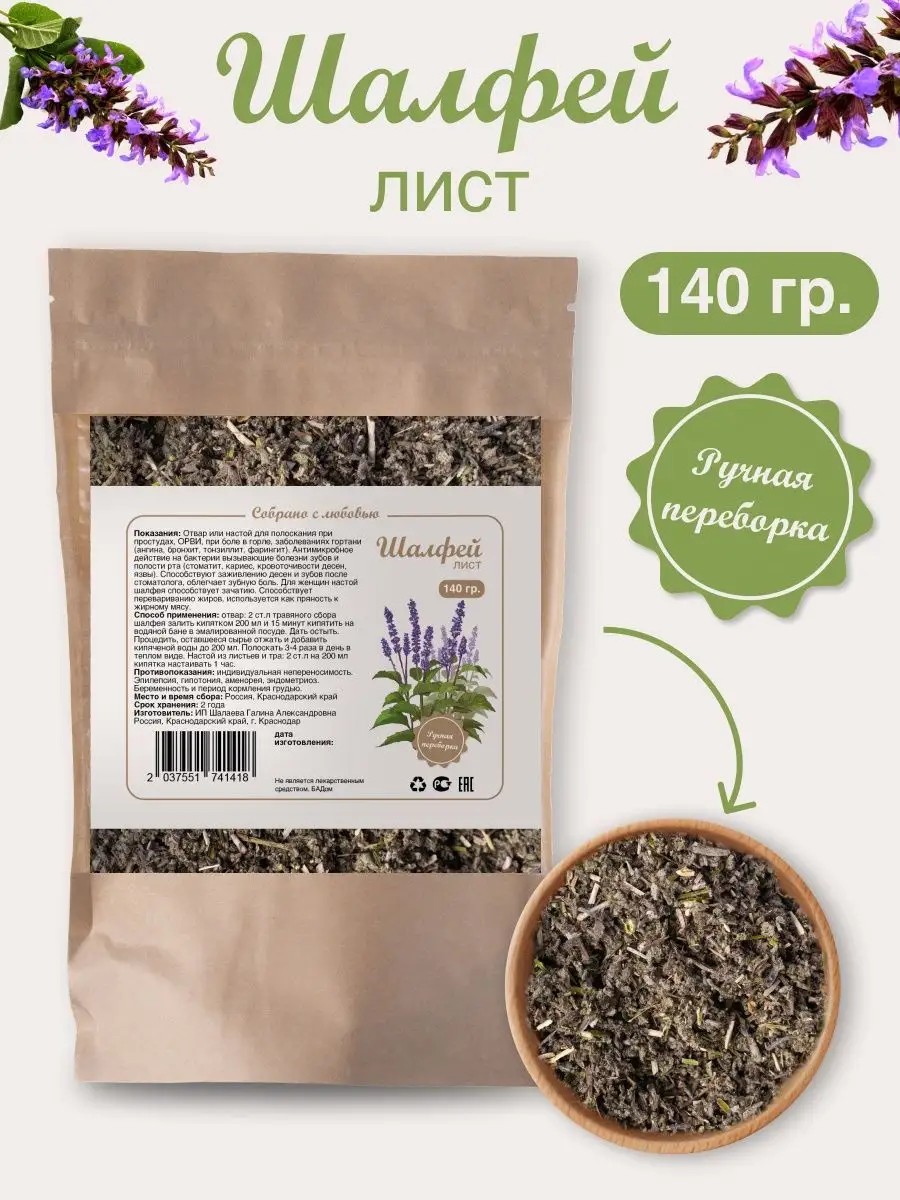 Dried sage harvested in the Krasnodar Territory. A decoction or infusion for gargling for colds, acute respiratory viral infections, sore throat, and laryngeal conditions (tonsillitis, bronchitis, tonsillitis, pharyngitis). It has an antimicrobial effect on bacteria that cause dental and oral diseases (stomatitis, caries, bleeding gums, ulcers). Sage leaves promote healing of gums and teeth after dental work and relieve toothache. For women, sage infusion promotes conception. Sage herb promotes fat digestion and is used as a spice for fatty meats. Contraindications: Individual intolerance, epilepsy, hypotension, amenorrhea, endometriosis. Pregnancy and breastfeeding. Directions: Decoction: Pour 2 tablespoons of sage herbal tea into 200 ml of boiling water and simmer for 15 minutes in an enamel bowl in a water bath. Let cool. Strain, squeeze out the remaining sage, and add boiled water to make up to 200 ml. Gargle 3-4 times daily while warm. Infusion of leaves and herbs: Add 2 tablespoons to 200 ml of boiling water and let steep for 1 hour.