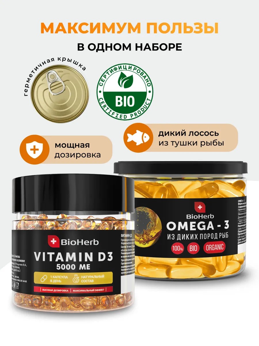 Bioherb Омега-3 DPA 360 + EPA 540 и Витамин D3 5000 МЕ в капсулах — для сердца, иммунитета и суставов