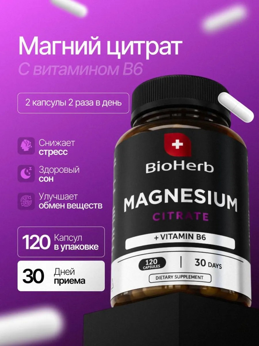 BioHerb Витамины магний цитрат с витамином B6 120 капсул, от стресса