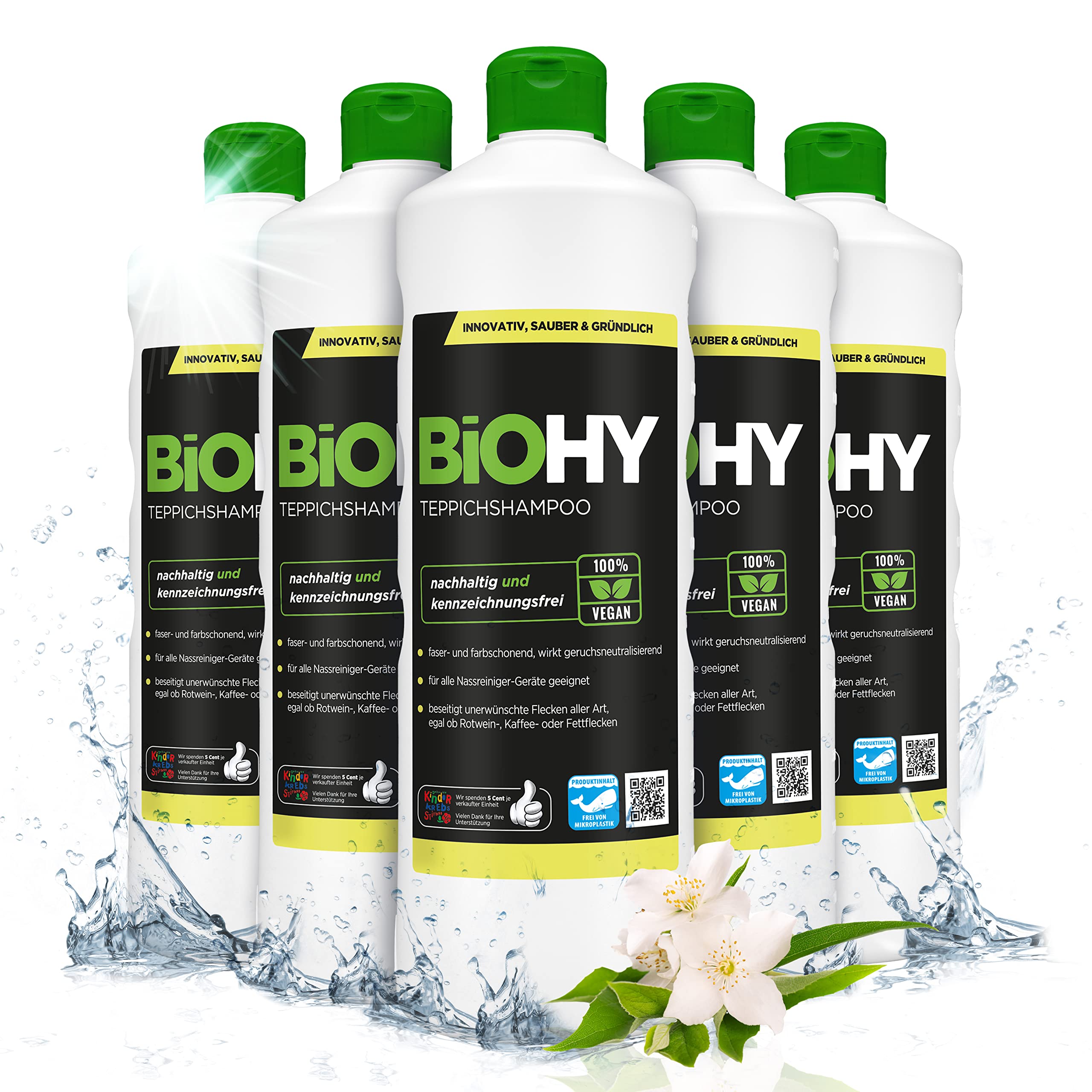 Of course we promise .that we take care of our environment unconditionally.Our cleaners are: 100 vegan, 100 free of microplastics, 100 biodegradable 100 made in Germany.This guarantees ""cleanliness with a clear conscience"".Of course Biohy:Our Biohy products love purity as well as the environment, humans and animals.They are effective, sustainable and deliberately economical.of course powerful:Our sustainable cleaner makes street or pet pollution, fat, coffee and red wine stains, as well as ketchup or shoe polish disappear in no time at all.Of course perfect care:The special active ingredients eliminate smells, leave a fresh fragrance and let old colors revive.Our carpet shampoo is also suitable for wet cleaner devices!.of course clean:Our carpet shampoo is a biohy professional cleaner and ideal for dirt and stains of all kinds. Attention: Please never use the concentrate undiluted!.