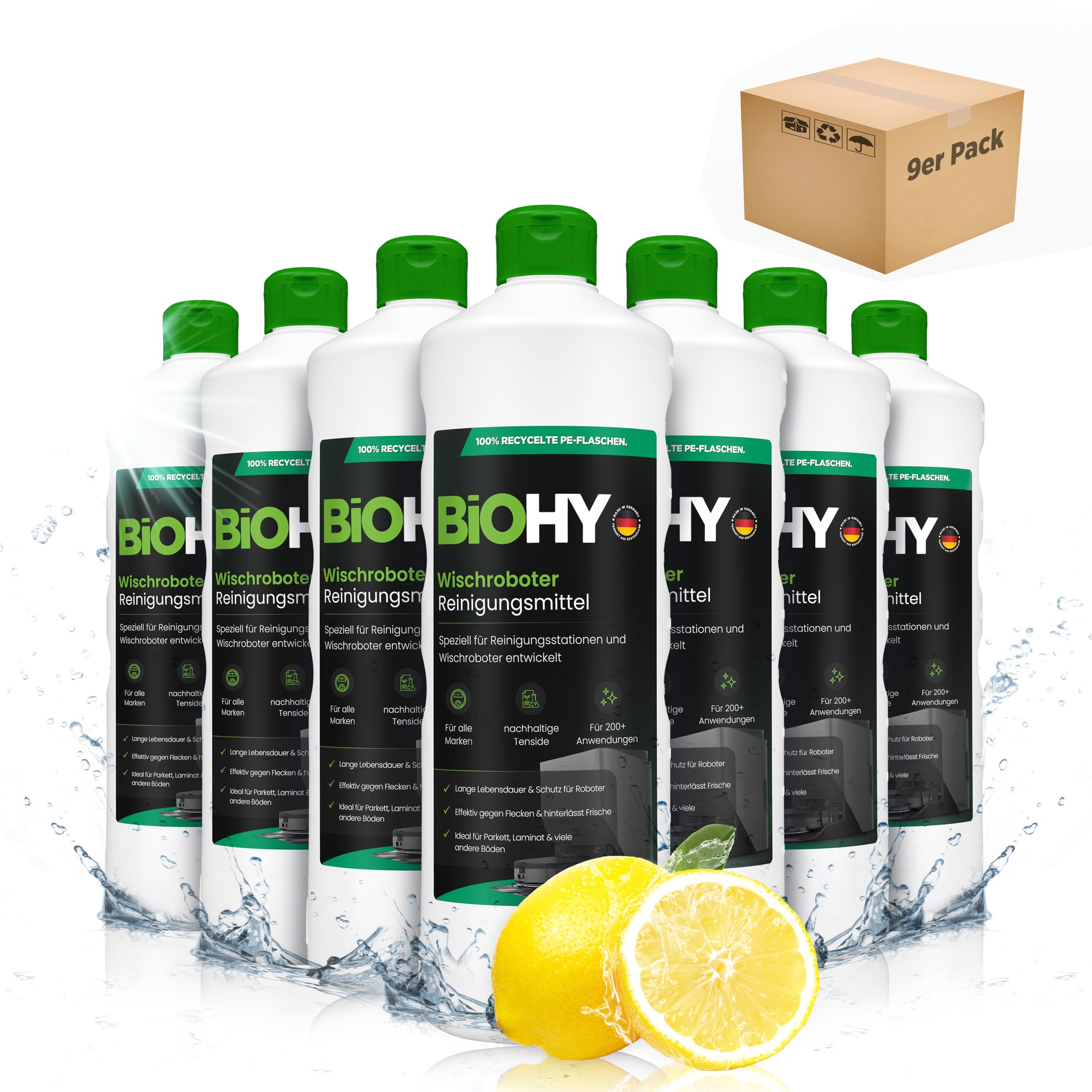 Biohy Wischroboter cleaning agent for cleaning stations (9 x 1 liter) |Extends the lifespan of the suction station |Low -foam cleaner concentrate lemon 1 l (9 Pack)