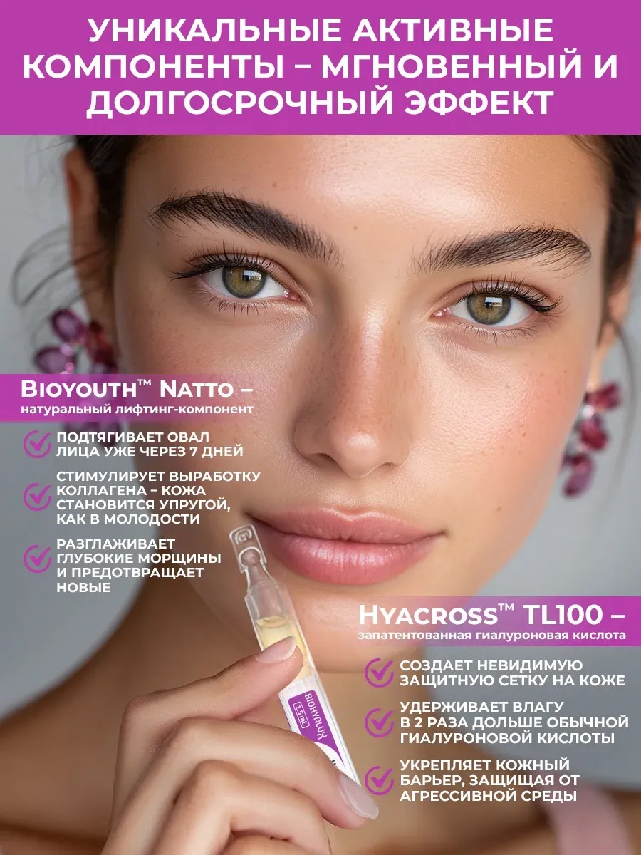 Biohyalux HA Lifting Firming Serum is a progressive development, a unique facial serum with a patented hyaluronic acid elastomer that forms a long-lasting biological protective mesh on the dermis's surface, reduces moisture evaporation, strengthens barrier functions, and actively counteracts external factors that cause damage and irritation. Natto bean extract, which intensively combats age-related changes and improves skin texture, combined with vitamin E, effectively reduces wrinkles, improves elasticity, and tightens pores, providing a pronounced lifting effect and leaving skin smoother and silkier. The lifting serum formula includes lactobacillus lysate. This is the ideal product for those seeking healthy, strengthened, and immune-boosting skin. The high vitamin B content unlocks the energy potential of epidermal cells and saturates them with oxygen. Peptidoglycans, short-chain peptides, and free amino acids stimulate collagen synthesis, accelerate cell renewal, and reduce the depth of wrinkles, leaving skin firmer and more saturated.