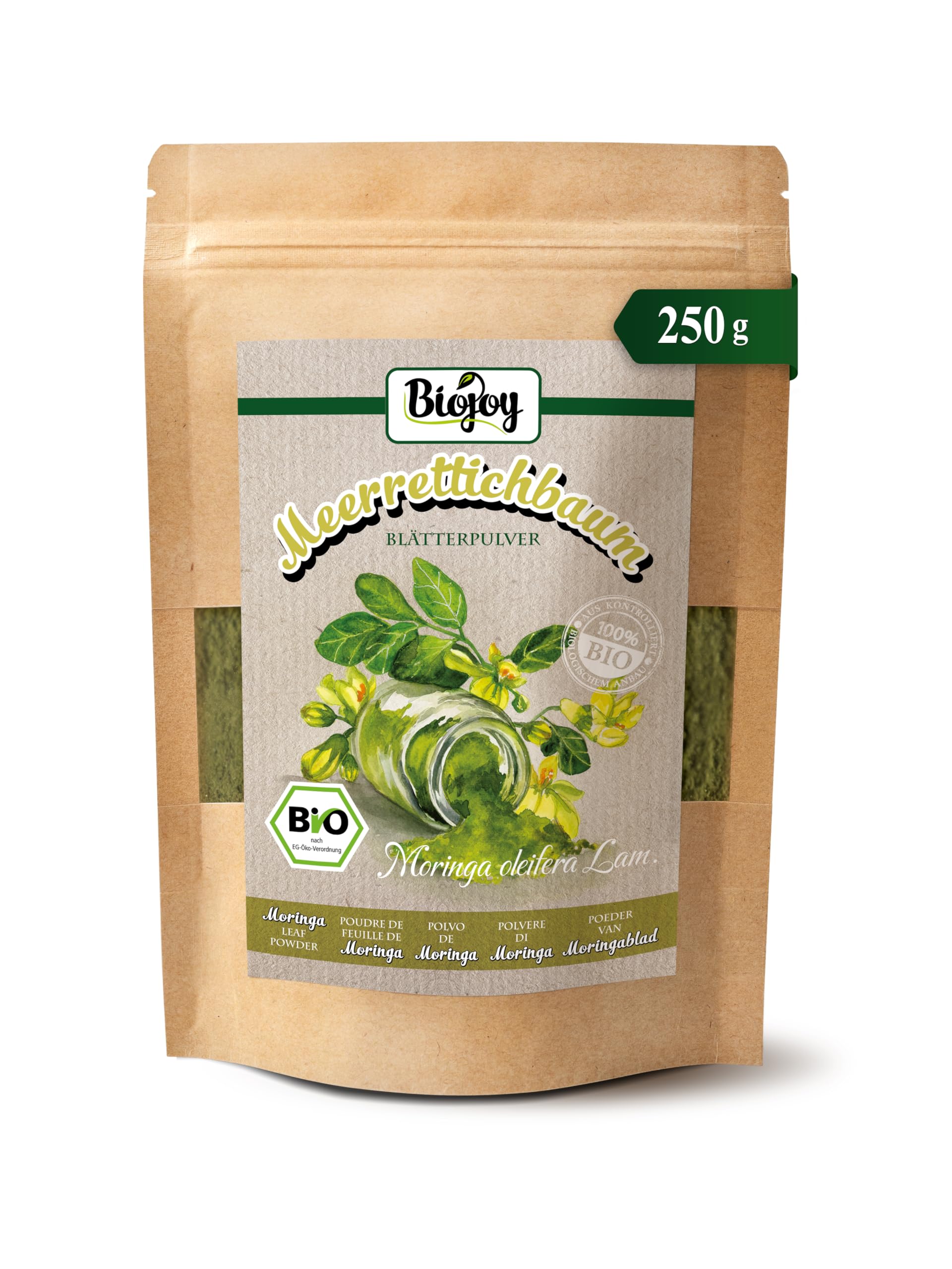 ? SAFETY WARNING Do not exceed the recommended daily dose. Food supplements should not replace a varied and balanced diet and a healthy lifestyle. Keep out of reach of young children. Use by pregnant women and children is not recommended. ? DIRECTIONS Directions for use: Take 5 g per day. Store in a cool, dry place. ? SATISFACTION If you would like to support our aspiration to provide high-quality organic moringa powder, please leave a brief rating or detailed review. Thank you in advance. ? OUR TIP The aroma of our organic moringa powder is similar to that of spinach, but with a spicy kick. Therefore, you can successfully combine the powder with spicy dishes, and also add a slightly spicy note to drinks. ? HOW? From our organic moringa powder, you can prepare aromatic hot and cold drinks by adding water. The powder is also used as a spice in smoothies, soups, stews, and other dishes. ? WHY? The moringa leaves are washed, dried, and then ground. Our organic moringa powder contains no additives, colorings, or preservatives. ? ORGANIC MORINGA POWDER High-quality green powder made from proven organic moringa leaves grown using organic farming methods. The leaves are natural, carefully dried, and ground into a fine powder – without additives.Biojoy Moringa en poudre BIO (250 g), Poudre de Feuilles de Moringa, sans additifs (Moringa oleifera Lam.)? SAFETY WARNING Ne pas dépasser la dose journalière recommandée. Les compléments alimentaires ne doivent pas se substituer à une alimentation variée et équilibrée et à un mode de vie sain. Ne pas laisser à la portée des jeunes enfants. L'emploi chez les femmes enceintes et chez les enfants est déconseillé. ? DIRECTIONS Conseils d'utilisation: Prendre 5 g par jour. Conserver dans un endroit frais et sec. ? SATISFACTION Si vous souhaitez nous soutenir dans notre aspiration pour fournir de la haute qualité de notre BIO poudre de moringa, veuillez donner, s il vous plaît, une brève évaluation ou un commentaire détaillé. Nous vous le remercions d avance. ? NOTRE CONSEIL L arôme de notre BIO poudre de moringa est similaire à celui des épinards, mais avec un piquant aromatique. Par conséquent, vous pouvez combiner avec succès la poudre avec des plats épicés, mais également donner aux boissons une nuance légèrement épicée. ? COMMENT? À partir de la BIO poudre de moringa, vous pouvez préparer des boissons aromatiques chaudes et froides en ajoutant de l eau. La poudre est également utilisée comme épice dans les smoothies, soupes, ragoûts et autres plats. ? POURQUOI? Les feuilles de moringa sont lavées, séchées et puis moulues. Notre BIO poudre de moringa ne contient ni additifs, ni colorants, ni conservateurs. ? BIO-MORINGA EN POUDRE Poudre verte de haute qualité de feuilles de moringa de qualité BIO éprouvée issue de l agriculture biologique. Les feuilles sont naturelles, soigneusement séchées et moulues en poudre fine - sans additifs.