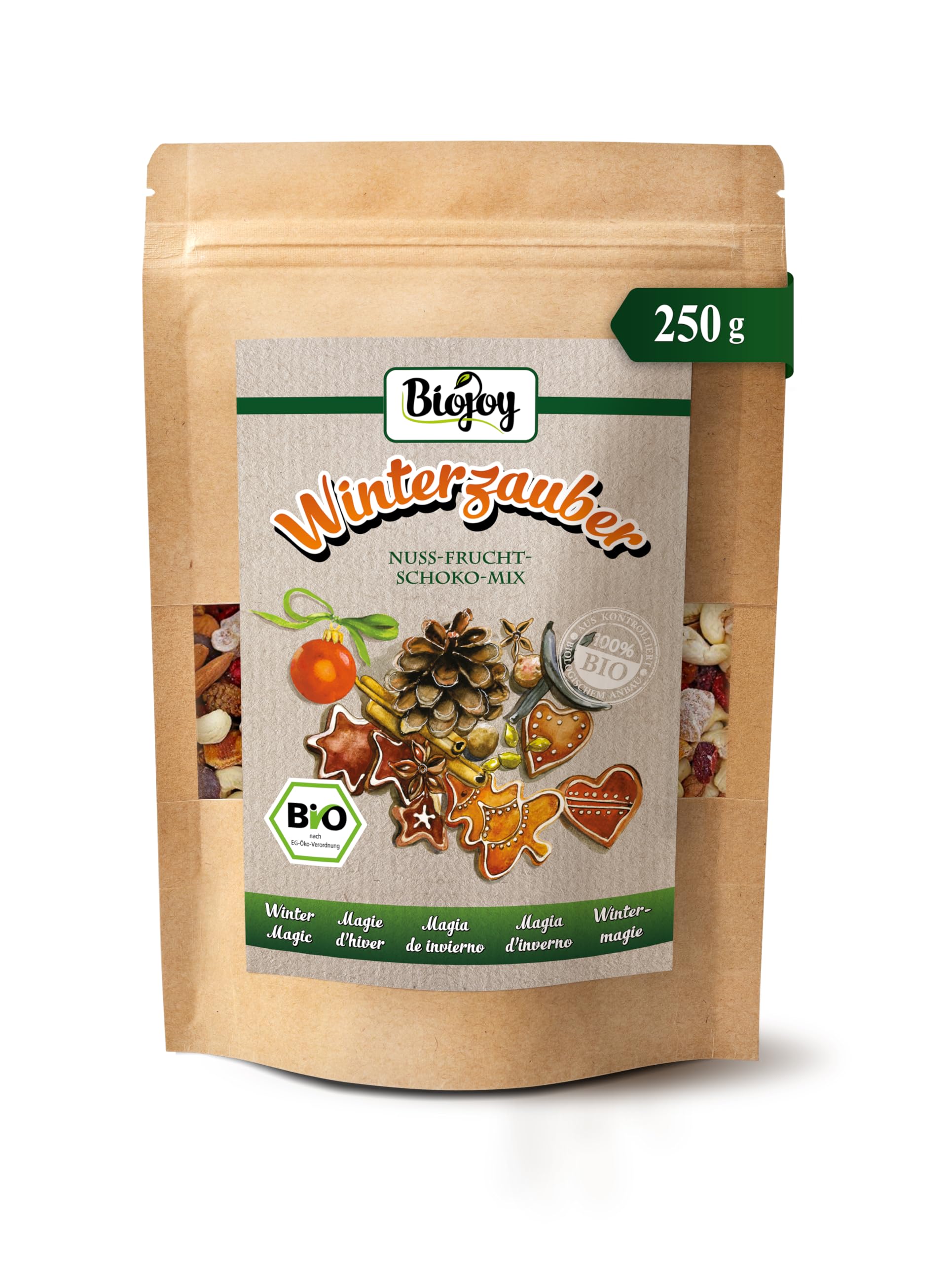 Winter Magic Organic is perfect as a refined snack during cozy Advent evenings or as a sweet treat at the office. It adds color and a festive touch to dessert and cookie platters and pairs beautifully with hot drinks like coffee, tea, or cocoa. Used as a topping on porridge, yogurt, fromage blanc, or bowls, this mix guarantees a deliciously magical experience. It can also be used in baking and to decorate winter treats, adding a touch of flair to your creative recipes. Whether you want to surprise your guests or simply treat yourself to something special – Winter Magic is always the right choice. INGREDIENTS Brown almonds 20 , cashew nuts 18 , white mulberries 12 , mango pieces 10 , cranberries 9 (cranberries 60 , cane sugar , sunflower oil ), chocolate corn flakes (corn flakes 56 (corn , raw cane sugar , sea salt), milk chocolate 29 (raw cane sugar , cocoa butter , whole milk powder , cocoa mass ), dark chocolate 7 (cocoa mass , raw cane sugar , cocoa butter ), glazing agent: gum arabic , raw cane sugar ), candied ginger (ginger 55 , raw cane sugar ), Brazil nuts 8 , dark chocolate couverture drops 8 (cocoa mass , cane sugar , cocoa butter , emulsifier: Soy lecithin , cocoa: 56.5 minimum) from certified organic farming. SAFETY WARNING May contain traces of other nuts. Nuts can pose a choking hazard for children. CONTAINS NATURALLY NATURALLY SUGARS. Store in a cool, dry place. See moreBiojoy Magie d'Hiver BIO – Mélange de fruits secs et de fruits à coque (250 g) à base d'amandes, noix de cajou, canneberges, mûres blanches, noix du Brésil et chocolat Mélange de fruits secs et de fruits à coque 250 gDESCRIPTION DU PRODUIT DESCRIPTION DU PRODUIT Magie d'Hiver BIO convient parfaitement comme en-cas raffiné lors de soirées cosy de l'Avent ou comme petite pause sucrée au bureau. Il apporte couleur et ambiance festive sur les plateaux de desserts et de biscuits, et s'accorde idéalement avec des boissons chaudes comme le café, le thé ou le cacao. Utilisé en topping sur du porridge, du yaourt, du fromage blanc ou des bowls, ce mélange garantit une expérience gourmande délicieusement magique. Il peut également être utilisé aussi bien pour la pâtisserie que pour décorer des douceurs hivernales, afin de sublimer vos recettes créatives avec goût. Que vous souhaitiez surprendre vos invités ou simplement vous offrir un petit plaisir particulier – Magie d'Hiver est toujours le bon choix. INGRÉDIENTS Amandes brunes 20 , noix de cajou 18 , mûres blanches 12 , morceaux de mangue 10 , canneberges 9 (canneberges 60 , sucre de canne , huile de tournesol ), flocons de maïs au chocolat (flocons de maïs 56 (maïs , sucre de canne brut , sel marin), chocolat au lait 29 (sucre de canne brut , beurre de cacao , lait entier en poudre , pâte de cacao ), chocolat noir 7 (pâte de cacao , sucre de canne brut , beurre de cacao ), agent d'enrobage : gomme arabique , sucre de canne brut ), gingembre confit (gingembre 55 , sucre de canne brut ), noix du Brésil 8 , gouttes de chocolat noir de couverture 8 (pâte de cacao , sucre de canne , beurre de cacao , émulsifiant : lécithine de soja , cacao : 56,5 minimum) issu de l'agriculture biologique contrôlée. AVERTISSEMENT DE SÉCURITÉ Peut contenir des traces d'autres noix. Les fruits à coque peuvent présenter un risque d'étouffement pour les enfants. CONTIENT DES SUCRES NATURELS. Conserver dans un endroit frais et sec. Voir plus