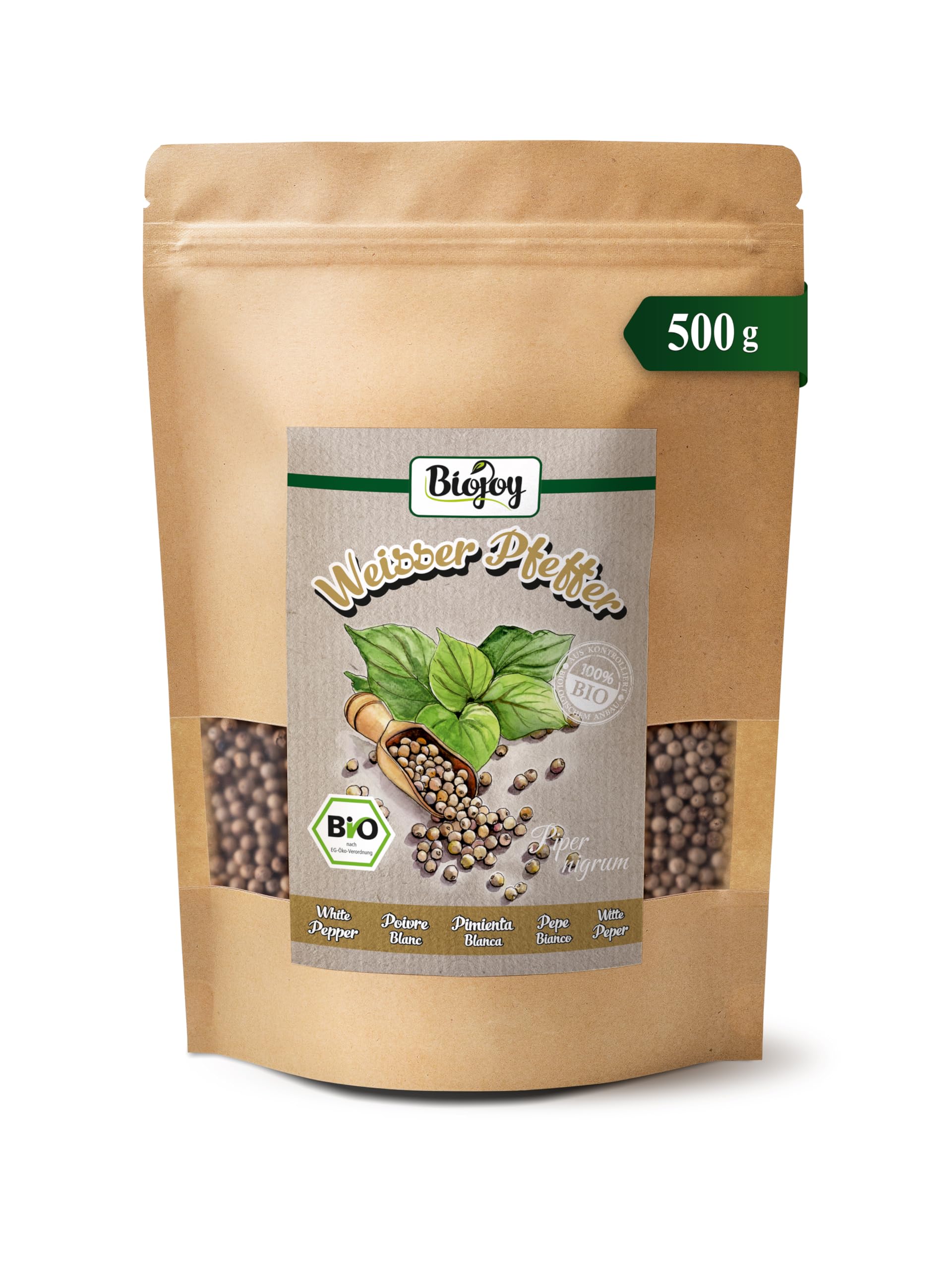 ? SATISFACTION We would love to know how satisfied you are with Biojoy's Organic White Pepper. Does it suit your taste? Please let us know with your rating! ? OUR TIPS The elegant spiciness of white pepper pairs particularly well with light meats, light sauces, and vinaigrettes. Use freshly ground or ground pepper for maximum aroma. ? HOW? White pepper is suitable for both grinding in a mortar and pestle and milling in traditional mills, where the peppercorns can be ground to the desired degree – from coarse to fine powder. ? WHY? The peppercorns of this variety come from organic pepper farms whose produce has received organic certification. ? ORGANIC WHITE PEPPER Aromatic and spicy organic white peppercorns. Carefully hulled, whole grains, dried, 100 natural and without spices.? SATISFACTION Nous serons heureux de savoir à quel point vous êtes satisfait du poivre blanc BIO de Biojoy. Est-ce que cela correspond à votre goût? S il vous plaît laissez-nous savoir avec votre évaluation!. ? NOS CONSEILS Le piquant élégant du poivre blanc s harmonise particulièrement avec les viandes légères, les sauces légères et les vinaigrettes. Utilisez du poivre fraîchement broyé ou moulu, il est alors très aromatique. ? COMMENT? Le poivre blanc convient à la fois au broyage dans un mortier et au moulinage dans des moulins classiques, où les grains sont moulus au degré souhaité - du moulinage grossier à la poudre fine. ? POURQUOI? Les fruits de cette variété de poivre proviennent de fermes de poivre biologique, dont les produits ont reçu le label BIO après une certification réussie. ? POIVRE BLANC BIO Grains blancs de poivre BIO aromatiques et épicés. Soigneusement débarrassés de la coque, grains entiers, séchés, 100 naturels et sans épices.Biojoy Poivre blanc en grains BIO (500 g), Graines de Poivre blanc pour moulin, sans additifs (Piper nigrum L.)