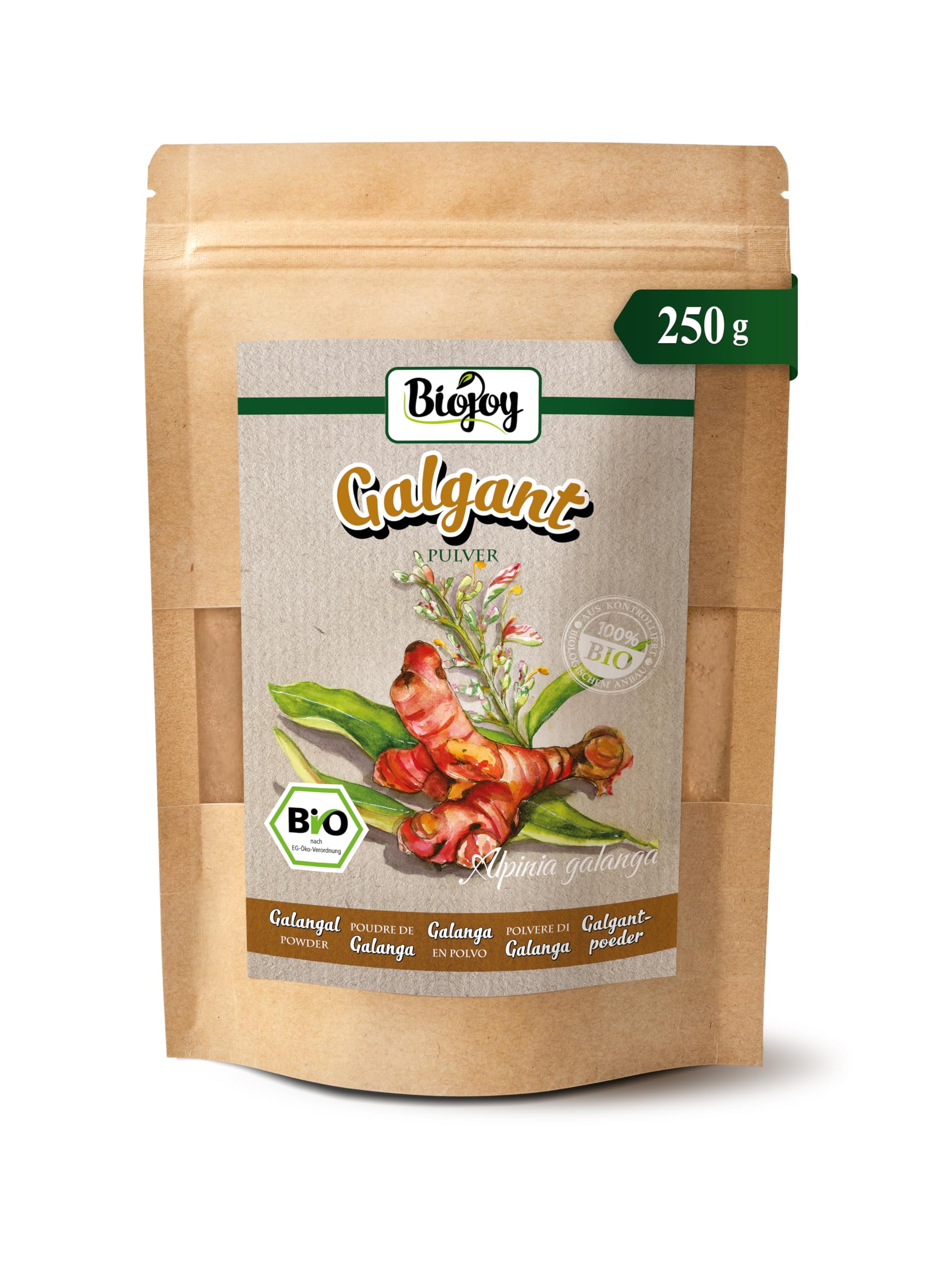 ? SATISFACTION Are you satisfied with the galangal powder – its organic quality and aroma? Please take this opportunity to rate this natural product from Biojoy! ? OUR TIPS Compared to freshly grated root, powdered galangal has an even more intense aroma. Therefore, use it sparingly at first and, if necessary, add more spice. ? HOW? Whether for making spiced tea, as an additive in Hildegard von Bingen's cooking, or for Asian cuisine, galangal powder offers numerous application possibilities. ? WHY? Our roots come from sustainable organic farming in India. They are rich in natural plant ingredients and can be easily measured in ground form. ? ORGANIC GALANGAL POWDER Ground galangal root from organic farming, carefully dried, 100 natural and 100 organic quality - very spicy and aromatic.? SATISFACTION Êtes-vous satisfait de la poudre de galanga - la qualité BIO et l arôme? Profitez-en, s il vous plaît, pour évaluer ce produit naturel de Biojoy!. ? NOS CONSEILS Comparé à la racine fraîchement râpée, le galanga en poudre a un arôme encore plus intense. Par conséquent, utilisez-le d abord avec parcimonie et, si nécessaire, ajoutez plus d épice. ? COMMENT? Que ce soit pour faire un thé épicé, comme additif dans la cuisine d Hildegard von Bingen ou pour la cuisine asiatique, la poudre de galanga offre de nombreuses possibilités d application. ? POURQUOI? Nos racines proviennent de l agriculture biologique durable en Inde. Elles sont riches en ingrédients végétaux naturels et peuvent être facilement dosées sous forme moulue. ? POUDRE DE GALANGA BIO Racine de galanga moulue issue de l agriculture biologique, soigneusement séchée, 100 naturelle et qualité 100 BIO - très épicée et aromatique.Biojoy Poudre de galanga BIO (250 g), Racine de galanga moulue, sans additifs (Alpinia galanga)