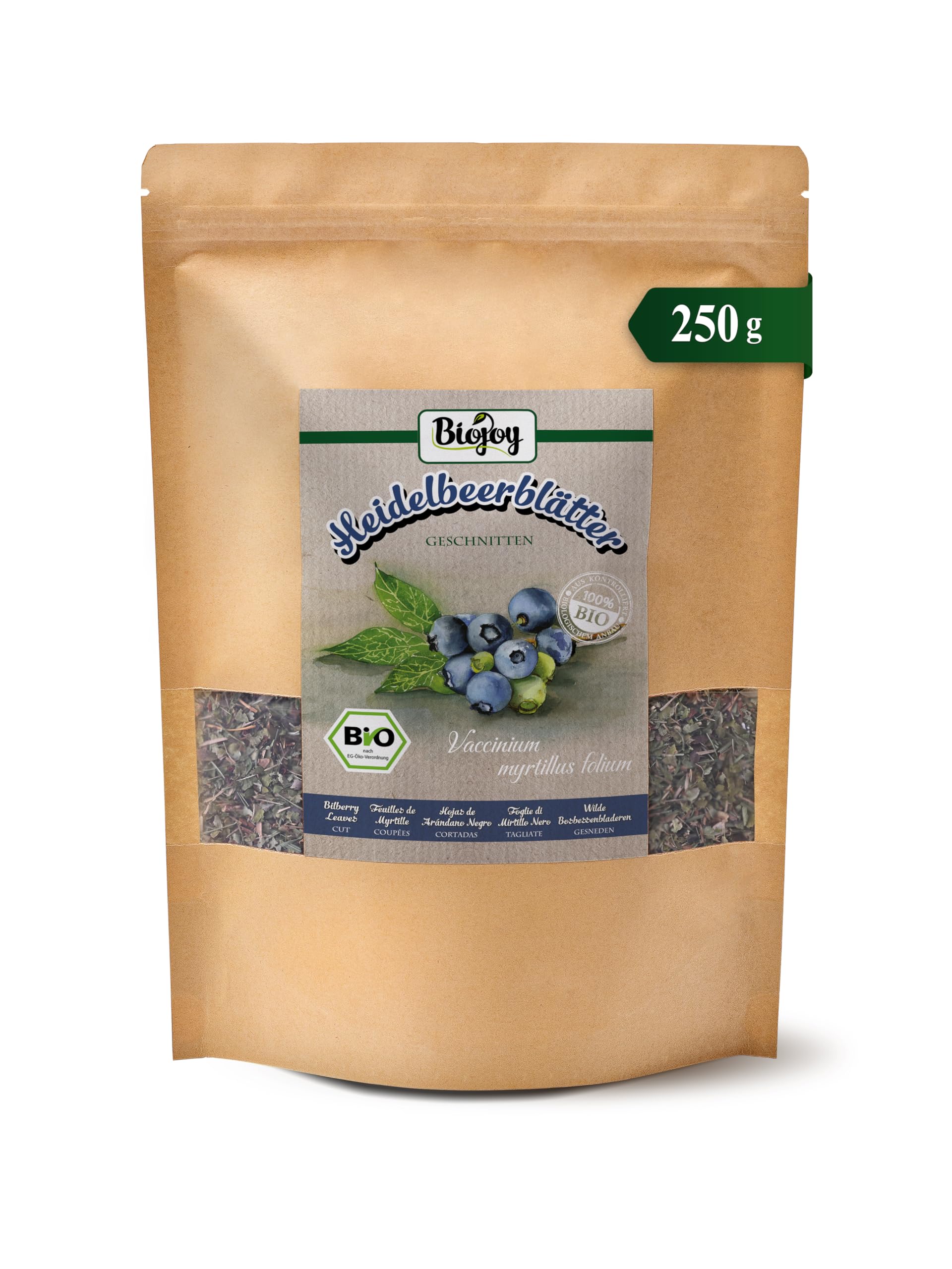 ? SATISFACTION Have you already used your blueberry leaves? We value your opinion! Your feedback helps us, as well as other customers, to guarantee the quality of our products. ? OUR TIP store the leaves in a dry place, away from light, and tightly sealed to preserve their aroma. That's why our packaging is resealable. After opening, we recommend that you reseal the bag tightly. ? HOW? The dried leaves are perfect for preparing herbal teas – on their own or as part of custom blends. They are also ideal as a natural and fragrance-free filler for scented sachets. ? WHY? Organic by conviction: Our blueberry leaves come from controlled organic farming. The organic label guarantees verified quality and environmentally friendly production. ? ORGANIC BLUEBERRY LEAVES Carefully dried and cut blueberry leaves, of preserved organic quality, without any additives – processed with care.? SATISFACTION Vous avez déjà utilisé vos feuilles de myrtillier ? Nous apprécions votre avis ! Votre retour nous aide, ainsi que les autres clients, à garantir la qualité de nos produits. ? NOTRE CONSEIL Conservez les feuilles dans un endroit sec, à l'abri de la lumière et hermétiquement fermées pour préserver leur arôme. C'est pourquoi notre emballage est refermable. Après ouverture, nous vous recommandons de bien refermer le sachet. ? COMMENT ? Les feuilles séchées conviennent parfaitement à la préparation de tisanes – seules ou comme partie de mélanges personnalisés. Elles sont également idéales comme remplissage naturel et neutre en parfum pour les sachets odorants. ? POURQUOI ? BIO par conviction : Nos feuilles de myrtille proviennent d'une culture biologique contrôlée. Le label BIO garantit une qualité vérifiée et une production respectueuse de l'environnement. ? FEUILLES DE MYRTILLE BIO Feuilles de myrtille soigneusement séchées et coupées, de qualité biologique préservée, sans aucun additif – transformées avec soin.Biojoy Thé de Feuilles de Myrtille BIO (250 g), Feuilles de Myrtille, séchées et coupées (Vaccinium myrtillus folium) 250 g (Lot de 1)