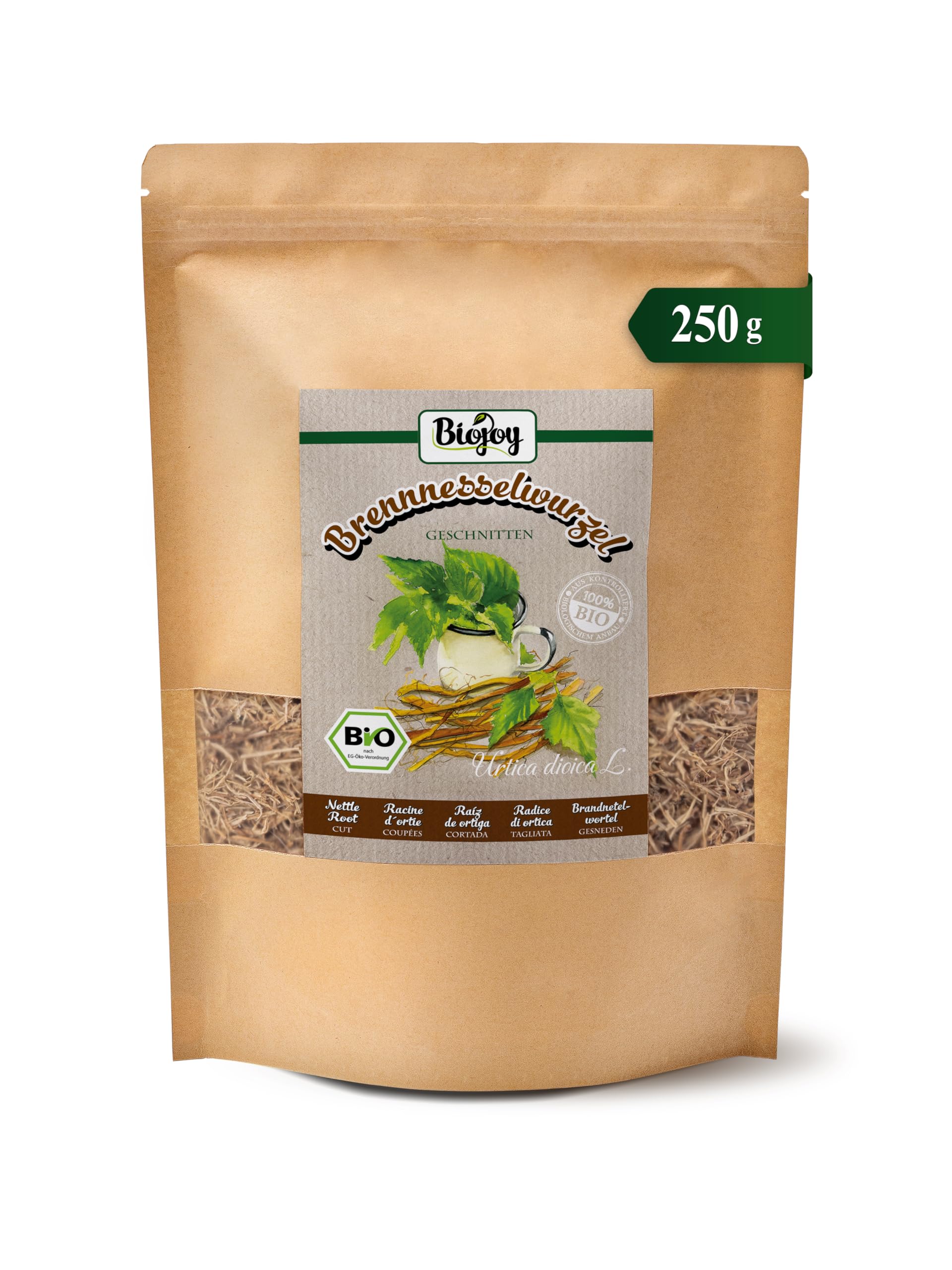 ? SATISFACTION Your opinion is important feedback for the Biojoy team. By rating our nettle root, you will help us maintain the highest quality standards at Biojoy. ? OUR TIP Pour one to two teaspoons of nettle root into a small carafe and add boiling water. After five minutes of steeping, strain the nettle root tea through a sieve into a cup. ? HOW? The tea, which can be easily prepared from dried roots, is similar to an herbal tea and is suitable for both drinking and external application as an infusion. ? WHY? At Biojoy, you only get natural products of certified organic quality. The nettle roots we use come from wild herbs harvested in suitable, unpolluted areas. ? ORGANIC NETTLE ROOT Naturally dried and cut - packed in protective packaging without additives - also suitable for preparing herbal teas.? SATISFACTION Votre avis est un commentaire de rétroaction important pour l équipe de Biojoy. Avec votre évaluation des racines d ortie, vous nous aiderez à maintenir la qualité de Biojoy au plus haut niveau. ? NOTRE CONSEIL Versez une à deux cuillères à thé de racines d'ortie dans une petite carafe et ajoutez de l'eau bouillante. Après cinq minutes d'infusion, filtrez le thé de racine d'ortie à travers une passoire dans une tasse. ? COMMENT? Le thé, que l on peut facilement préparer à partir des racines séchées, semblable à une tisane, convient aussi bien à la consommation qu à l application externe sous forme d infusion. ? POURQUOI? Chez Biojoy, vous obtenez uniquement des produits naturels de qualité certifiée BIO. Les racines d ortie que nous utilisons proviennent d herbes sauvages récoltées dans des zones appropriées et non polluées. ? RACINE D'ORTIE BIO Naturellement séchées et coupées - emballées dans un emballage protecteur sans additifs - convient également pour la préparation de tisanes.Biojoy Tisane de Racine d'ortie BIO (250 g), Racine d'ortie séchée et coupée (Urtica dioica L.)