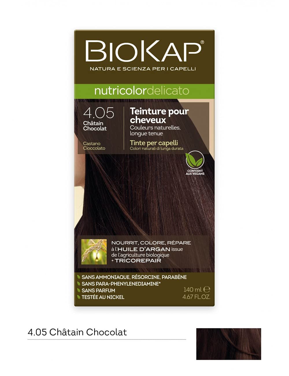 fiber a willow derivative that protects hair from UV damage fruit acids that care for the scalp and help prolong color and organic argan oil with nourishing and moisturizing properties to deeply repair damaged hair. Package contents: One tube of BioKap Nutricolor Coloring Cream (50 ml) One bottle of Nutrifix color enhancer (75 ml) One Shampoo Conditioner (15 ml) to use after dyeing One Barrier Cream One pair of gloves One protective cape. INSTRUCTIONS FOR USE: Apply the Nutricolor Delicato hair dye using the protective cape and gloves provided. Mix the BioKap Nutricolor coloring cream (50 ml) and Nutrifix (75 ml) according to the instructions. Apply the mixture to your hair, ensuring even coverage. Leave it on for 35 minutes. Rinse with water and use the Baume shampoo (15 ml) to cleanse your hair.coloration cheveux Nutricolor Delicato chatain chocolat 4.05DESCRIPTION DU PRODUIT DESCRIPTION DU PRODUIT La coloration pour cheveux Nutricolor Delicato est formulée à base de 90 d'ingrédients végétaux, dont huile d'argan biologique. Les colorations nutricolor Delicato sont garanties sans ammoniaque, ni parabènes, ni résorcine, sans nickel, sans parfum ni para-phénylènediamine. Testé sous contrôle dermatologique. (Ne dispense pas de faire un test d'allergie avant application). La coloration nutricolor délicato se décline en 8 teintes naturelles et assurent une parfaite couverture des cheveux blancs quelque soit le pourcentage de cheveux blancs. Les plus du produit: Un résultat quasi professionnel et durable ! Une application facile grâce à la cape de protection à usage unique fournie, et au flacon de crème protectrice pour contour du cuir chevelu. Les colorations nutricolor nourrissent et colorent durablement les cheveux grâce à une combinaison d'actifs végétaux dont : protéines de riz qui régénèrent la fibre un dérivé de saule qui protège le cheveu des agressions UV acides de fruits qui prennent soin du cuir chevelu et aident à faire durer la coloration l'huile d'argan biologique aux vertus nourrissantes et hydratantes pour réparer en profondeur les cheveux abîmés Contenu du paquet: un tube de BioKap Nutricolor Crème Colorante (50 ml) un flacon de Nutrifix qui révèle la couleur (75 ml ) un Shampooing Baume (15 ml) à utiliser après la teinture. une Crème Barriere une paire de gants une cape protectrice MODE D'EMPLOI Appliquez la coloration Nutricolor Delicato en utilisant la cape de protection et les gants fournis. Mélangez la crème colorante BioKap Nutricolor (50 ml) et Nutrifix (75 ml) selon les instructions. Appliquez le mélange sur les cheveux, assurant une couverture uniforme. Laissez agir pendant 35 minutes. Rincez à l'eau et utilisez le shampooing Baume (15 ml) pour nettoyer les cheveux.Coloration permanente enrichie en huile d'argan bio, 90 d'ingrédients naturels, sans amoniaque, sans résorcine, sans para-phénilènediamine ni parfum, Temps de pose 35 minutes.