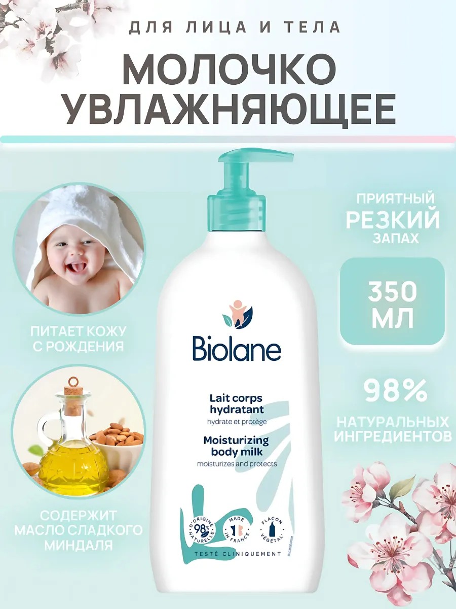 Biolane Gentle Nourishing Body Lotion is ideal for dry, sensitive, atopic skin in newborns, children, and adults. This caring cream-butter for hands, body, and face is designed for sensitive and atopic skin. This body cream moisturizes and softens after showering and bathing, maintains elasticity, and protects against dryness during the heating season. Its lightweight formula with panthenol absorbs quickly and supplies delicate skin with moisture for 24 hours. This panthenol-containing lotion is suitable for all skin types: normal and oily, dry and combination, problematic, and sensitive. Lait Corps Hydratant Hand Lotion is especially essential during the winter. Its active protection complex prevents excessive moisture loss through baby's skin. This lightweight and surprisingly gentle 0+ product with a convenient dispenser deeply moisturizes and protects baby's delicate skin. It protects against diaper rash and relieves redness and irritation, even in newborns' intimate areas. The product contains over 98% plant-based ingredients. Suitable for babies from birth and for the whole family. Biolane is hypoallergenic cosmetics for children, made in France. The main active ingredients are beeswax and sweet almond oil. Suitable for use after bathing and showering. This skin care product contains beeswax, which has excellent soothing and protective properties, smoothing and healing chapped skin. It rejuvenates and nourishes the skin thanks to antioxidants and vitamin A. Sweet almond oil relieves dryness and irritation, improves elasticity, and tones the skin. The dispenser makes it convenient for daily use and baby care. It is recommended for application to the hands and face of women, men, and teenagers. The milk-gel is used in daily care. Pharmacy cosmetics. Emollient. Made in France. French children's care cosmetics for babies.