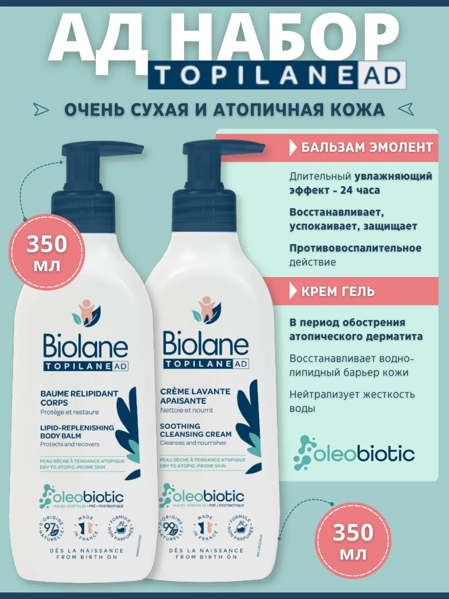 Детский набор уходовой косметики при обострении атопического дерматита от Biolane. 1) Липидовосстанавливающий питательный увлажняющий атопик бальзам для тела и лица Biolane (350 мл) предназначен для ежедневного ухода за сухой, очень сухой и склонной к атопии кожи у детей. Натуральный - 97% ингредиентов натурального происхождения. Моментально обеспечивает увлажнение и питание, успокаивает сухую кожу, способствуя уменьшению зуда и раздражения. Увлажняющий дермопедиатрический крем-уход для атопичной кожи рук и ног регулирует микробиом и укрепляет защитные функции. Масло ши обеспечивает интенсивное восполнение липидов, уменьшая сухость и ощущение стянутости. Активная формула дермокосметики для детей: моментальное увлажнение, восстановление кожи. Эмолент TOPILANE AD заметно продлевает ремиссию при атопии. Для младенцев, детей и взрослых. Уходовая аптечная косметика Biolane БЕЗ КОНСЕРВАНТОВ И ПАРАБЕНОВ. 2) Дермопедиатрический гель для купания новорожденных объемом 350 мл. 99% ингредиентов натурального происхождения. Гель успокаивающий для купания для регулярного ухода за телом и волосами. Очищающий крем обогащен комплексом активных компонентов. Гель-душ для тела и волос бережно очищает и увлажняет кожу, не пересушивая ее, нейтрализует жесткость воды. Имеет увлажняющие и смягчающие свойства. Обогащенный комплексами и липидами растительного происхождения, гель для душа питает и удерживает влагу. Подходит для ежедневного применения. Гель для душа не содержит сульфаты, фталаты, феноксиэтанол и мыло. Подходит для мытья волос, головы, тела и интимной гигиены. Разработан с учетом нежной чувствительной детской кожи. Не щиплет глазки. Восстанавливает водно-липидный барьер кожи, устраняет чувство зуда. Гипоаллергенный, обладает смягчающими и питательными свойствами. Сбалансированный состав для обезвоженной атопичной кожи.