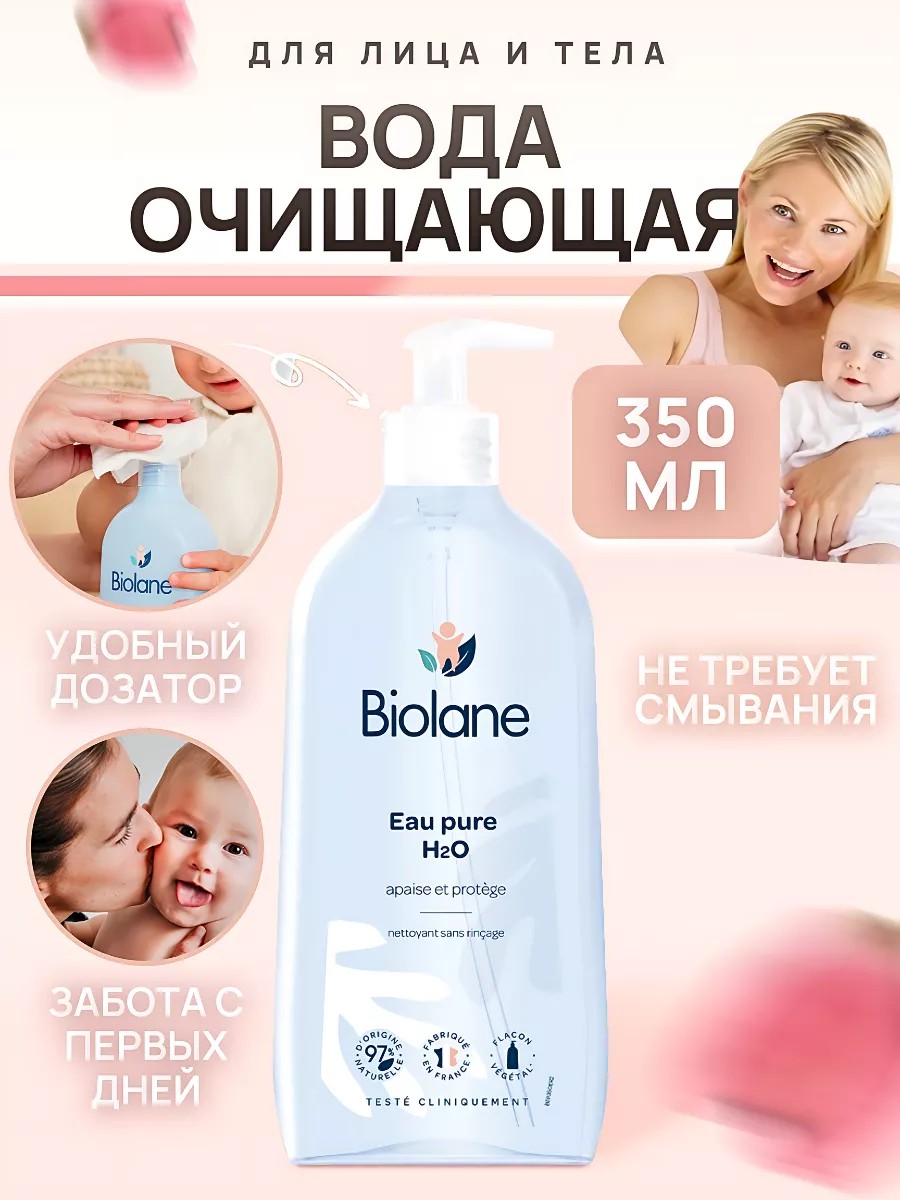 Biolane Н2О очищающая жидкость для детей с первых дней жизни не требующая смывания. Вода Eau Pure 350 мл универсальное суперпрактичное средство для ежедневной гигиены и ухода за чувствительной кожей новорожденного позволяет тщательно очистить лицо, тело и область под подгузником попку малыша без последующего смывания,избегая тем самым контакта с водой. Обеспечивает моментальное очищение кожи, увлажняет, уменьшает покраснение. Применяется для первых обмываний малыша, как замена ежедневного купания, очищения интимной зоны при каждой смене памперса,после прививок.