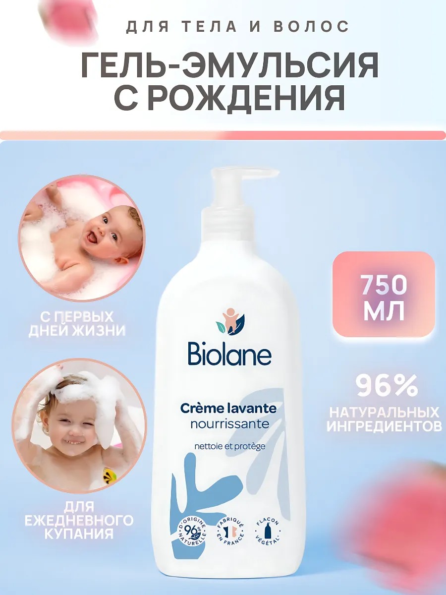 Biolane нежный увлажняющий гель-пена для ежедневного купания детей с рождения и взрослых. Мягкое средство эмульсия Crème Lavante Nourrissante обеспечит бережное очищение и уход за кожей малышей с первых дней жизни. Средство для подмывания младенцев имеет кремообразную текстуру и жемчужный оттенок. Обогащенная увлажняющая формула нежно очищает и смягчает кожу и волосы, компенсирует действие жесткой воды, оставляя приятный аромат после использования, питательный для атопичной кожи. Уникальный состав детской уходовой косметики делает его безопасным для использования уже с первых дней жизни малыша. Мягкая формула не раздражает глазки и не вызывает слез при купании. Натуральные ингредиенты исключительно нежного действия не только берегут кожу новорожденного младенца от пересыхания, но и успокаивают её, предотвращая появление раздражений. Благодаря своему гипоаллергенному составу, который сбалансирован по показателю рН, это жидкое мыло идеально подходит для детей с чувствительной кожей. Не содержит мыла. Детский гель-пена подходит для интимной гигиены, а также для ухода за телом, лицом и руками. Мягкая моющая основа очищает кожу и не высушивает ее. Протеины пшеницы укрепляют тонкие дектские волосы, делая их более мягкими и послушными для расчесывания. Благодаря гелевой консистенции продукт легко растворяется в воде, образуя нежную пенку, которая очищает кожу, не вызывая разражения глаз (купание без слез). Нежное и бережное средство для детской интимной гигиены станет надежным помощником в процессе купания и ухода. Гипоаллергенно - разработано для минимизации риска аллергических реакций. Снижает дискомфорт, признаки сухости и атопического дерматита. 96 % ингредиентов природного происхождения. Натуральный состав без мыла, сульфатов и фталатов. Удобный дозатор обеспечивает легкость в использовании, позволяя дозировать нужное количество средства одним нажатием. Средство для купания базового ухода за нежной детской кожей подходит для мытья волос, тела и интимной гигиены.
