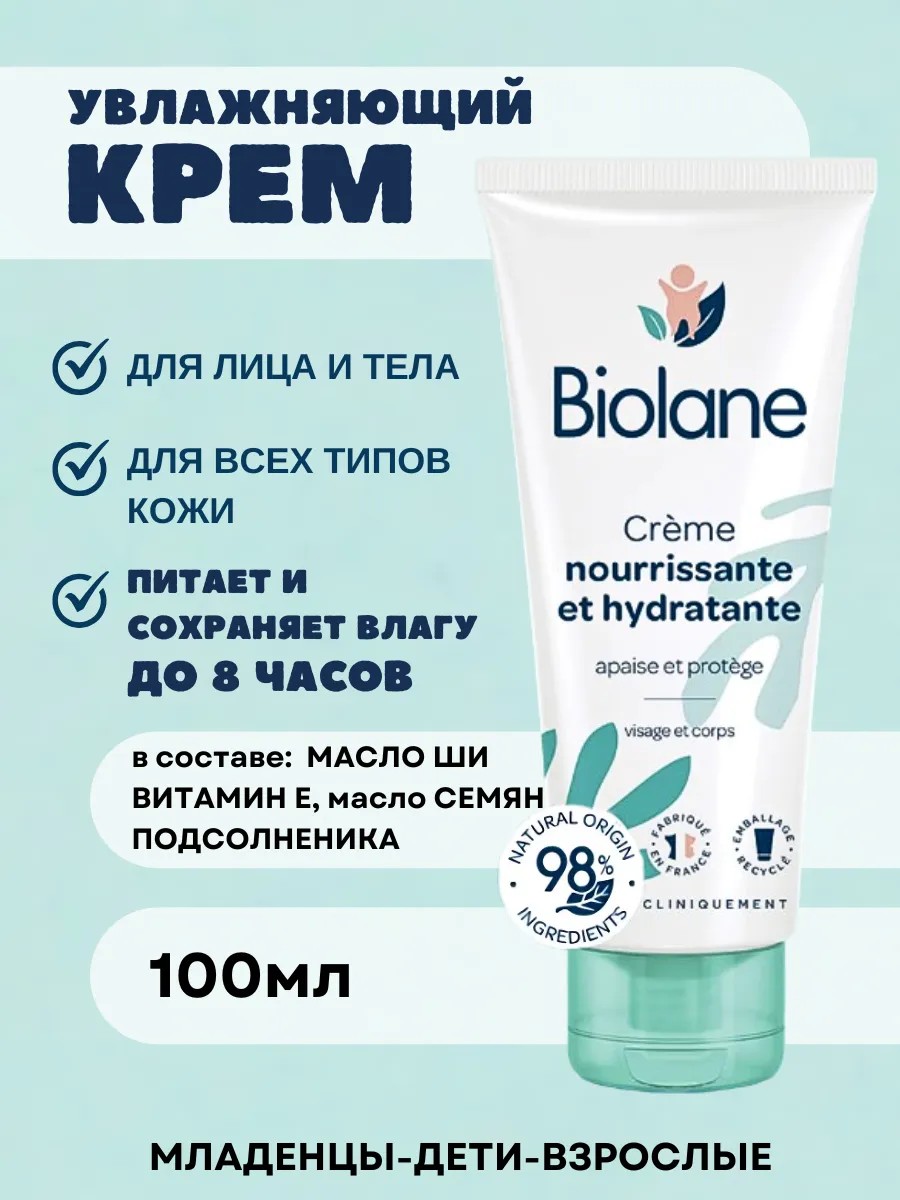 Biolane детский нежный крем для бережного ухода за чувствительной кожей малыша с рождения 0+. Питательный крем для лица и тела станет самым любимым помощником маме в заботе о младенце. Увлажняющий крем для новорожденных подходит для всех типов кожи, в том числе очень сухой, раздраженной и атопичной (atopic), склонной к шелушению и зуду, и всех возрастов – младенцам, детям, взрослым. Специально разработанный состав косметики с гипоаллергенной формулой 98% ингредиентов натурального происхождения обеспечивает комфортное увлажнение и надежную защиту, сохраняет и восстанавливает естественный гидролипидный слой. Масло подсолнечника и витамины А и Е смягчают и питают кожу. Пантенол (инулин) успокаивает, снимает покраснения и раздражения, способствует быстрой регенерации. Масло ши смягчает огрубевшие участки, придает коже гладкость, защищает от негативного воздействия ультрафиолетовых лучей. Эмоленты снабжают кожу влагой на длительное время, восстанавливают и делают ее эластичной. Крем для детей Biolane имеет легкую консистенцию и быстро впитывается, делая кожу гладкой и бархатистой без ощущения липкости и жирной пленки после нанесения. Заживляющий крем-молочко эффективно увлажняет кожу при атопическом деоматите и других кожных заболеваний. Безопасность косметического аптечного средства подтверждают результаты независимых клинических исследований. Крем-уход не содержит вредных химических веществ, парабенов, парфюмерии и красителей, что делает его идеальным выбором для нежной и склонной к аллергии кожи младенцев. Способ применения: нанести небольшое количество крема тонким слоем на лицо и ручки малыша. Легкими массирующими движениями распределить крем по телу. На особенно чувствительные или сухие участки нанести большее количество продукта. Дать впитаться. Подходит для ежедневного применения. Прекрасный подарок для мамочек и их малышей – детская уходовая аптечная косметика Biolane для лица и тела, рук и ног станет отличным подарком на день рождения, в роддом, 8 марта!