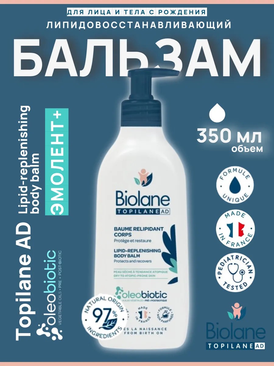 Крем-эмолент гипоаллергенный для взрослых и детей с рождения Biolane Topilane AD 350мл поможет сохранить здоровье и красоту кожи на длительное время. Липидовосстанавливающий бальзам для тела это эффективная лечебная французская косметика для ежедневного ухода за очень сухой, чувствительной и атопической кожей. Питательный натуральный крем-уход помогает справиться с сухостью, облегчает зуд тела, раздражения на лице. Имеет специально разработанную кремовую текстуру, которая тает на коже, оставляя защитную пленку для восстанавливающего эффекта. Смягчающий крем-барьер для рук без запаха и отдушки от дерматита состоит 97% ингредиентов натурального происхождения и помогает от трещин и сухости. Обеспечивает длительное увлажнение до 24 часов, снижает покраснения и шелушения через 2 дня применения. Эмолент lipid-replenishing body balm 0+ подходит для нежной и бережной заботы о коже новорожденных, детей и подростков, склонной к атопии. В формулу атопик крема входит высокая концентрация липидных агентов, олеолипидный комплекс для глубокого питания и успокоения очень сухой и атопичной кожи. Увлажняющая эмульсия для детей восстанавливает естественный защитный кожный барьер, масло ши и пчелиный воск глубоко питают и смягчают, обеспечивая длительный и глубокий увлажняющий эффект против АД экземы. Обеспечивается интенсивное восполнение липидов, происходит уменьшение сухости и ощущения стянутости. Успокаивающий эмолент с рождения, обогащенный витамином b3, снижает чувствительность кожи, укрепляя естественные защитные силы. Безопасный состав: без гормонов, отдушек, парабенов. Не вызывает жжения при нанесении. Без липкости и жирной плёнки, как у мази. Биолан подходит даже для детской кожи – можно использовать на самых чувствительных участках. Универсальность и комфорт: один крем-бальзам – для лица, рук и тела. Заменяет несколько средств и делает ежедневный уход простым и эффективным. Особенно необходим в сезоны холода,ветра,отопления и контакта с водой. Эффективен для поддержания увлажненности при дерматите, экземе, псориазе. Содержит натуральные эмоленты и лечебный комплекс масел и экстрактов.