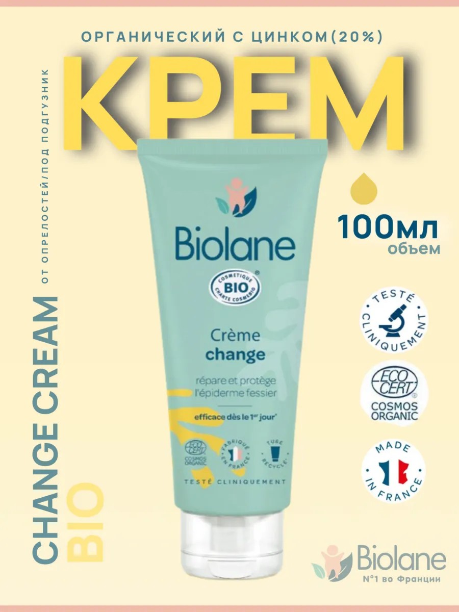 Детский увлажняющий органический крем Biolane Cream Change 100 мл с оксидом цинка (20%) идеально подходит для эффективной защиты и восстановления кожи лица и тела новорожденных с рождения 0+. Питательный крем для очень сухой и раздраженной кожи младенцев разработан специально для восстановления кожного барьера и интенсивного увлажнения. В безопасном составе 99% органических компонентов натурального происхождения, не разрушающих естественный барьер эпидермиса новорожденного младенца. Формула защитного крема обладает противовоспалительным и противомикробным свойством. Сбалансированный комплекс масла миндаля, масла семян подсолнечника и Алоэ Вера, успокаивает раздражения, снимает покраснения и заживляет кожу, обладает противомикробным и подсушивающим действием. Успокаивающий детский крем для лица и тела устраняет сухость и препятствует появлению опрелостей. Отлично справляется с акне новорожденных и потничкой. Крем для очень сухой кожи от раздражения является незаменимым средством при склонности к атопическому и пеленочному дерматиту, при пролежнях, акне у взрослых. Незаменимый и полезный подарок для мамы и малыша в сумку в роддом, на выписку. Применение: наносить при каждой смене подгузника, не втирать. После интимной гигиены наносить крем на хорошо высушенную кожу ягодиц и паховой области плотным слоем. При потничке и акне новорожденных - наносить точечно, не втирать, плотным слоем. Крем для лица и тела можно использовать и для рук, что делает его универсальным средством для ежедневного ухода. Благодаря легкой текстуре и быстрому впитыванию, он не оставляет жирных следов и обеспечивает длительное увлажнение. Гиппоалергенная отдушка без силиконов, парабенов, красителей. Подходит для ежедневного использования.
