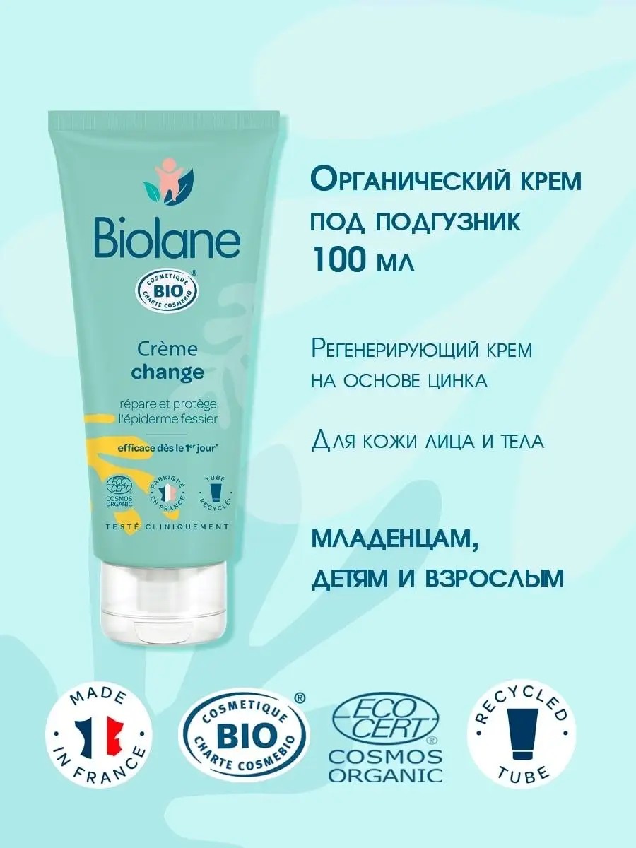 Biolane Organic Diaper Cream. Certified Organic by ECOCERT. Restores and protects baby's sensitive skin with every diaper change. Prevents redness and irritation. Suitable for babies from the first days of life. Has anti-inflammatory and antimicrobial properties. Soothes irritation, reduces redness and heals the skin, has an antimicrobial effect. With every diaper change, for newborn acne, prickly heat, for the face and body, for abrasions, scratches, and insect bites. RESULT: Softens the skin and soothes irritation, reduces redness and prevents redness and irritation. Formula with zinc oxide. A balanced complex of almond oil, sunflower seed oil and aloe vera soothes irritation, relieves redness and heals the skin. 99% of the total composition is of natural origin. 100% of ingredients come from organic farming. "TRANSPARENT COMPOSITION": AQUA (WATER) - purified water, ZINC OXYDE - soothing, CAPRYLIC / CAPRIC TRIGLYCERIDES - EMOLENT, PRUNUS AMYGDALUS DULCIS ALMOIND OIL - sweet almond oil, COCO CAPRYLATE CARPATE - emollient, GLYCERIN - moisturizing, PROPANEDIOL - moisturizing, POLYGLYCERYL-2 DIPOLYHYDROXSTEARATE - emulsifier, POLYGLYCERYL-3 DISOSTEARATE - emulsifier, HYDRAGENATED CASTOR OIL - moisturizing, MAGNESIUM SULFATE - nutrition, INULIN - protection, SODIUM GLUCONATE - stabilizer, SODIUM DENYDROACETATE - moisturizing, TOCOPHEROL - antioxidant, FRUCTOSE - Nutrition, ALOE BARBADENSIS LEAF JUICE POWDER - aloe vera, HELIANTHUS ANNUUS (SUNFLOWER) SEED OIL - moisturizing. APPLICATION: Apply with each diaper change, do not rub. After intimate hygiene, apply the cream to well-dried skin of the buttocks and groin area in a thick layer. For prickly heat and acne in newborns - apply pointwise, do not rub, in a thick layer. Packaging is made of plant-based material (sugar cane). Eco-friendly product, biodegradable formula.