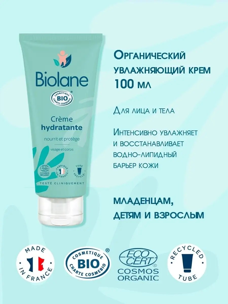 Biolane Органический увлажняющий крем специально разработан для восстановления водно-липидного барьера кожи интенсивного увлажнения кожи. ПРОТЕСТИРОВАНО ПОД ПЕДИАТРИЧЕСКИМ КОНТРОЛЕМ! Косметика сертифицирована Органическая - Экосерт (ECOCERT). 99% общего состава природного происхождения. 100% ингредиентов поступают от Органического земледелия. Результат: снимает раздражение, смягчает и питает кожу. "ПРОЗРАЧНЫЙ СОСТАВ": AQUA (WATER) - очищенная вода, GLYCERIN - увлажнение, BUTYROPSERMUM - масло ши, PARK (SHEA) BUTTER, CAPRYLIC/CAPRIC TRIGLYCERIDES - ЭМОЛЕНТ, COCOGLECERIDES - ЭМОЛЕНТ, SUCROSE STEARATE - эмульгатор, CETEARYL ALCOHOL - эмульгатор, SORBITANE CAPRYLATE - эмульгатор, INULIN - защита, PARFUM (FRAGRANCE) - натуральный ароматизатор, XANTHAN GUM - уплотнитель, SODIUM GLUCONATE - стабилизатор, GETYL PALMITATE - смягчающее средство, CITRIC ACID - регулятор pH, SODIUM STEAROYL GLUTAMATE - консерватор, TOCOPHEROL - антиоксидант, SODIUM DENYDROACETATE - увлажнение, FRUCTOSE - питание, HELIANTHUS ANNUUS (SUNFLOWER) SEED OIL - увлажнение, ALOE BARBADENSIS LEAF JUICE POWDER - алоэ вера, BENZOIC ACID - консерватор. ПРИМЕНЕНИЕ: нанесите средство на чистую сухую кожу не менее 2 раз в день, при этом особое внимание следует уделять наиболее сухим участкам кожи. Подходит для детей с первых дней жизни. СВОЙСТВА: детский увлажняющий крем специально разработан для восстановления водно-липидного барьера кожи интенсивного увлажнения. Предотвращает раздражение. Обогащенная увлажняющая органическая формула Алоэ Вера, Масло Ши и масло семян Подсолнечника смягчает и питает кожу. Натуральная отдушка. Упаковка изготовлена из материала на основе растительного сырья (сахарного тростника). Экологически чистый продукт, биоразлагаемая формула. Условия предосторожности и хранения: только для наружного применения. При попадании в глаза, промойте их водой. Хранить в местах, недоступных для детей. Хранить при температуре от +15° до +25°С.