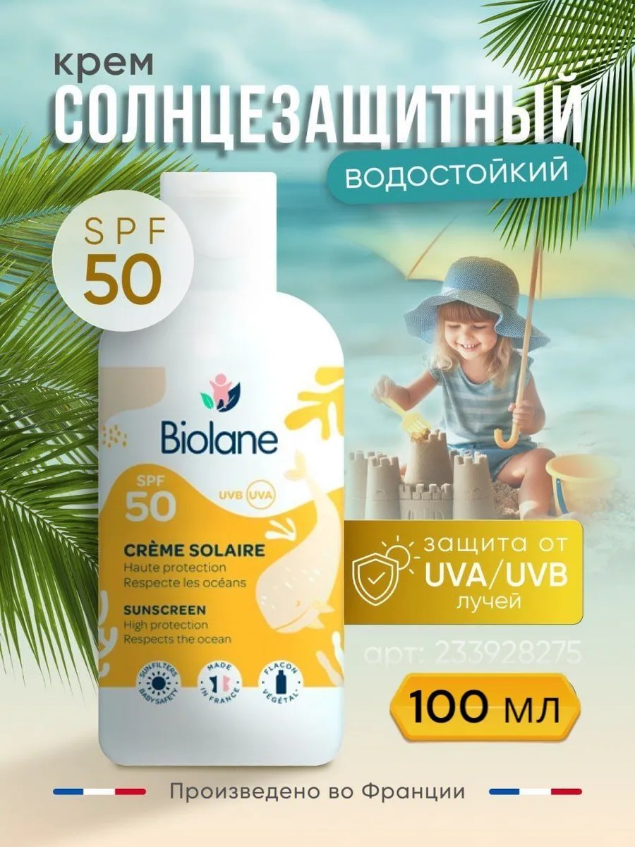 BIOLANE France. Biolane sunscreen for children SPF 50. Volume 100 ml. Sunscreen DERMATOLOGICALLY TESTED! Maximum protection (P++++). Children's sunscreen with SPF 50 protection for direct application to damp skin for newborns, infants and toddlers 0+. Designed specifically for delicate baby skin, it prevents burns and protects the skin. Protects the sensitive skin of a child and newborn from sun exposure. Very high protection SPF 50. DIRECTIONS FOR USE: Apply sunscreen to the skin of the face and body 20-30 minutes before sun exposure. Apply the cream every 2 hours and each time after bathing or swimming. Children under 3 years of age should not be exposed to the sun. Avoid exposure to the sun, especially between 11 a.m. and 4 p.m. Prolonged exposure to the sun is dangerous, even if you use sunscreen. UVA and UVB protection products do not provide 100% protection. Keep young children out of direct sunlight. Use additional protection (clothing). PROPERTIES: 1.
