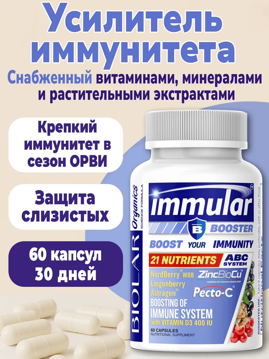 Immune Booster от BIOLAR Organics — это комплекс витаминов, минералов, аминокислот и растительных экстрактов, созданный для поддержки общего тонуса, повышения устойчивости организма к нагрузкам и сохранения естественных защитных функций.