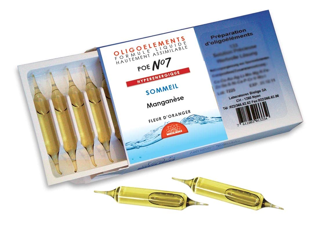 : Box of 20 x 2ml ampoules. Also available in 100ml and 500ml bottles. When our body is not functioning properly, it is biologically logical (logical with life) to use what naturally activates our metabolism: trace elements. Pioneers for over 40 years in the use of catalytic trace elements and plants, Bioligo Laboratories, drawing on their extensive experience, have combined knowledge and expertise to create a new range of high-quality, highly effective, and completely natural complexes: the Bioligophyt range. Bioligo Laboratories use catalytic trace elements in ionized form, the only directly assimilable and effective form. To these trace elements, Bioligo Laboratories have added plants with the same beneficial properties in the form of total plant extracts. Each Bioligophyt product acts easily, effectively, and comprehensively. Food supplement. This is not an ingredient. Ingredients: Water, Maltose Syrup, Citrus sinensis (Orange Blossom), Natural Flavoring, Manganese Sulfate. P.when('A').execute(function(A) { A.on('a:expander:toggle_description:toggle:collapse', function(data) { window.scroll(0, data.expander. expander[0].offsetTop-100) }) }) Directions for use: Adults: 2 ml (1 ampoule), 1 to 3 times daily. Children up to 10 years: 1 ml (1 2 ampoule), 1 to 3 times daily. Before or between meals, take one undiluted dose, hold under the tongue for 30 seconds, then swallow. Disclaimer: Food supplement. This is not a medicine. It is not a substitute for a varied and balanced diet and a healthy lifestyle. Not suitable for children under 3 years. Do not exceed the recommended dose. Keep out of reach of children. See moreThis trace element preparation is indicated for stress, emotional sensitivity, irregular sleep, lack of concentration, or during exam periods. It combines catalytic trace elements (manganese) with orange blossom to regulate nervousness, soothe anxiety, balance sleep, and promote concentration. This highly absorbable trace element preparation is taken under the tongue.Description du produit En boîte de 20 ampoules de 2 ml. Disponible également en flacon de 100ml et en flacon de 500ml. Lorsque notre organisme fonctionne mal ou moins bien, il est bio-logique (logique avec la vie), d'utiliser ce qui naturellement active nos métabolismes : les oligoéléments. Pionniers depuis plus de 40 ans de l'usage des oligoéléments catalyseurs et des plantes, les laboratoires Bioligo, forts de leur longue expérience, ont réuni connaissances et savoir-faire pour réaliser une nouvelle gamme de complexes de qualité très efficace et totalement naturelle : la gamme Bioligophyt. Les laboratoires Bioligo emploient les oligoéléments catalyseurs sous forme ionisée, seule forme directement assimilable et efficace. A ces oligoéléments, les laboratoires Bioligo ont adjoint des plantes aux mêmes vertus sous forme d'extrait total de plantes. Chaque Bioligophyt agit de façon aisée, efficace et globale.Complément alimentaire. Ceci n'est pas Ingrédients Eau, Sirop de maltose, Citrus sinensis (Fleur d'oranger), Arôme naturel, Sulfate de manganèse. P.when('A').execute(function(A) { A.on('a:expander:toggle_description:toggle:collapse', function(data) { window.scroll(0, data.expander. expander[0].offsetTop-100) }) }) Mode d'emploi Adultes : 2ml (1 ampoule), 1 à 3 fois par jour. Enfants jusqu'à 10 ans : 1ml (1 2 ampoule), 1 à 3 fois par jour. Avant ou en dehors des repas, une dose non-diluée, garder sous la langue pendant 30 secondes puis avaler. Clause de non-garantie Complément Alimentaire. Ceci n'est pas un medicament. Ne se substitue pas à une alimentation variée et équilibrée, et à un mode de vie sain. Ne convient pas aux enfants de moins de 3 ans.Ne pas dépasser la dose conseillée. Tenir hors de portée des enfants. Voir plusCette préparation en Oligoélément est indiquée en cas de stress, émotivité, sommeil irrégulier, manque de concentration ou en période d'examens. associe des oligoéléments catalyseurs (Manganèse) à la Fleur d'oranger pour réguler la nervosité, apaiser l'anxiété, équilibrer le sommeil et favoriser la concentration. Préparation en oligoéléments hautement assimilable sous la langue.BIOLIGO Préparation en oligoéléments - POE N 7 - Fleur d'oranger - Manganèse - 20 ampoules de 2ml