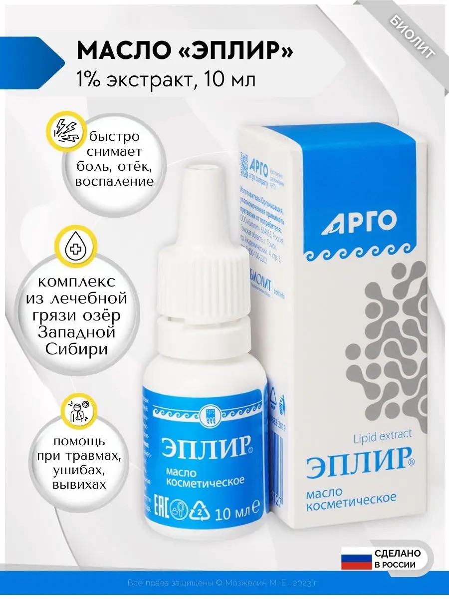 Эплир масло Арго 1% выпускает Биолит. Это масляный экстракт липидов лечебной грязи от отеков. Косметическое масло снимает боль и воспаление. Обладает ранозаживляющим и регенерирующим действием. Препятствует образованию рубцов и спаек. Восстанавливает скожу и слизистые при ранах и язвочках. Эплир масло Арго 1% от Биолит применяется для суставов и спины при остеохондрозе. Помогает от ожогов и при фурункулах. Используется при заболеваниях кожи и геморрое. Можно использовать смоченные раствором тампоны или салфетки 1 раз в сутки. От насморка несколько капель закапать в нос 3 раза в день по 1-2 капли. От геморроя применять в виде смоченных 1 % масляным раствором эплира тампонов после дефекации в течение 2 недель.