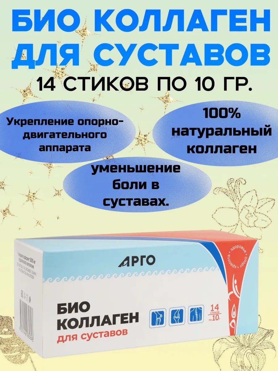 Коллаген для суставов 14 стиков от компании «Арго» – это удобная форма поддержания здоровья опорно-двигательного аппарата. Продукт создан для укрепления суставов, сухожилий и связок, способствует сохранению подвижности и снижению дискомфорта при нагрузках. Коллаген в саше-стиках легко брать с собой и использовать в любое время дня.