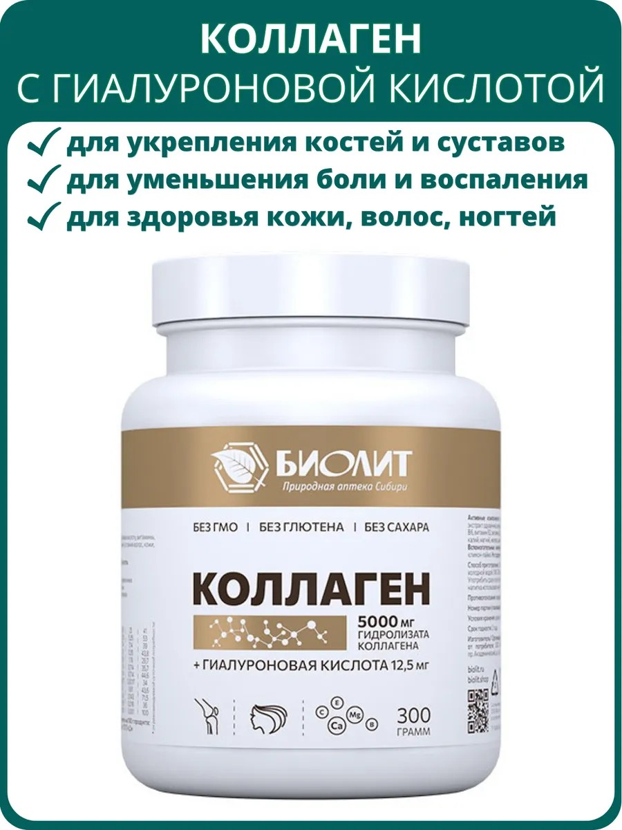 Коллаген с гиалуроновой кислотой от Биолит, 300 г. Источник микроэлементов для укрепления костей, суставов, волос и зубов.
