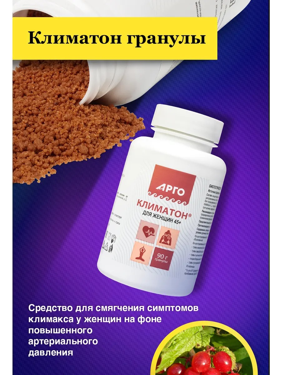 Климатон гранулы арго предназначены для смягчения симптомов климакса у женщин на фоне повышенного артериального давлении.