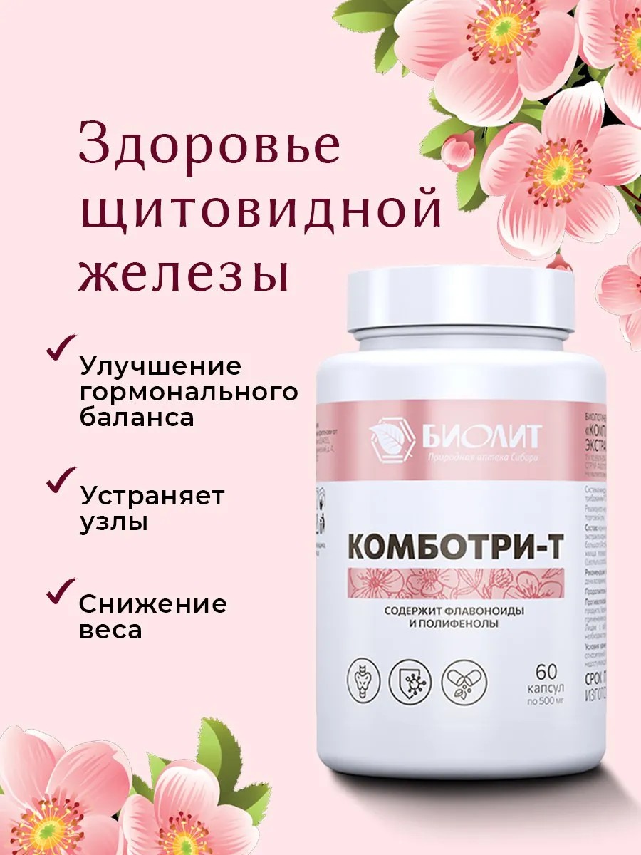 Растительный комплекс с лапчаткой белой Комботри-Т от Биолит предназначен для оптимизации работы щитовидной железы. Активные компоненты комплекса способствуют нормализации гормонального баланса и препятствует размножению патогенных клеток. Натуральный природный комплекс обладает антиоксидантными, иммуномодулирующими и противовоспалительными свойствами. Регулярный прием Комботри-Т благотворно влияет на нервную систему: снижает нервозность, поднимает настроение, улучшает сон.