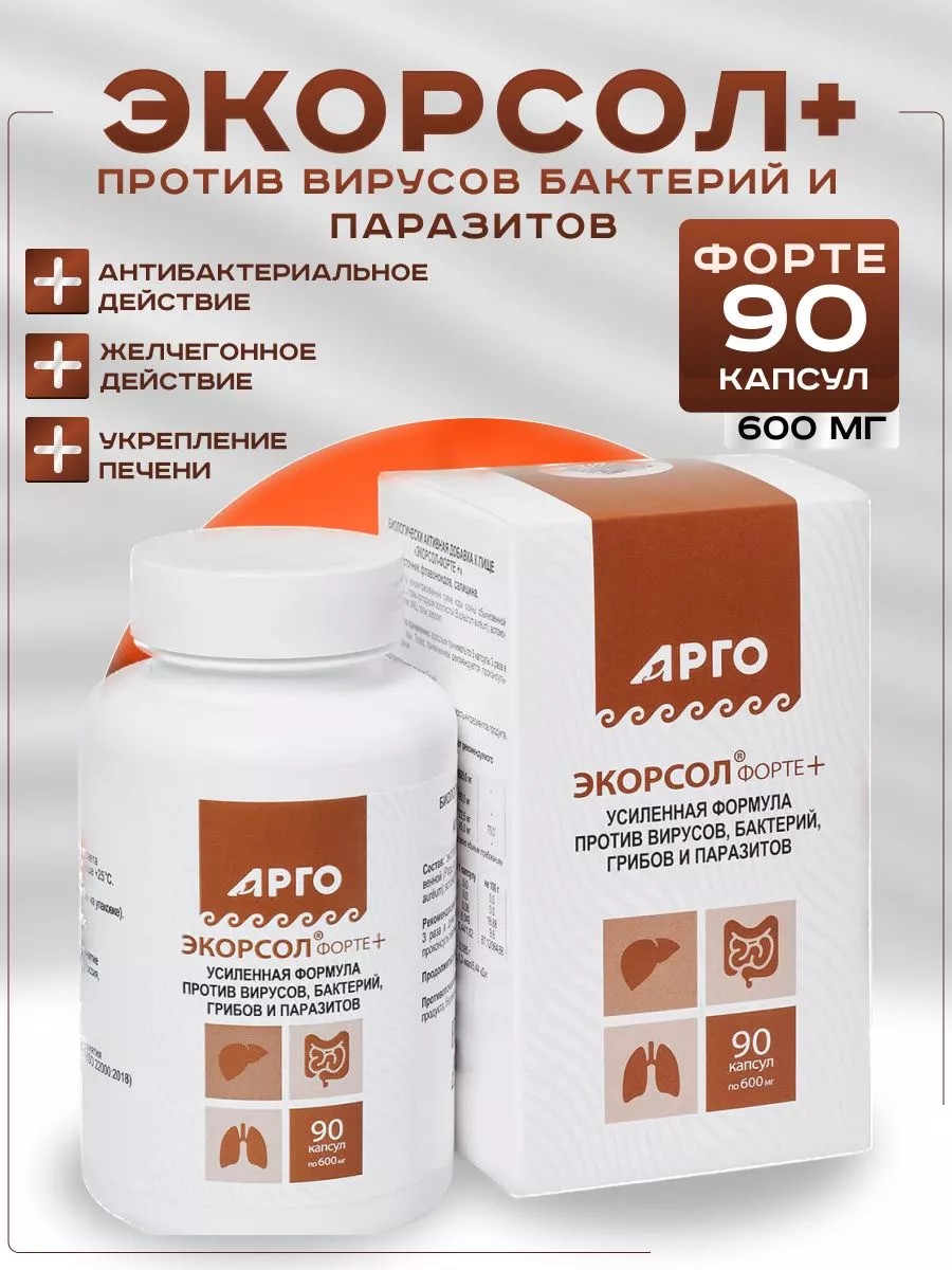 Ecorsol Forte+ improves liver and biliary tract function in opisthorchiasis. For the prevention and enhancement of drug therapy: acute and chronic opisthorchiasis, especially in the presence of contraindications to the use of synthetic anthelmintic agents; during repeated courses of deworming; gallbladder dyskinesia, cholecystitis, cholangitis, and hepatocholecystitis; as an effective choleretic agent. Adults: 3 capsules 3 times daily with meals. Duration of treatment: 7 days. According to preclinical studies, the active ingredients of aspen bark and goldenrod have anti-opisthorchiasis, choleretic, anti-inflammatory, and hepatoprotective effects.
