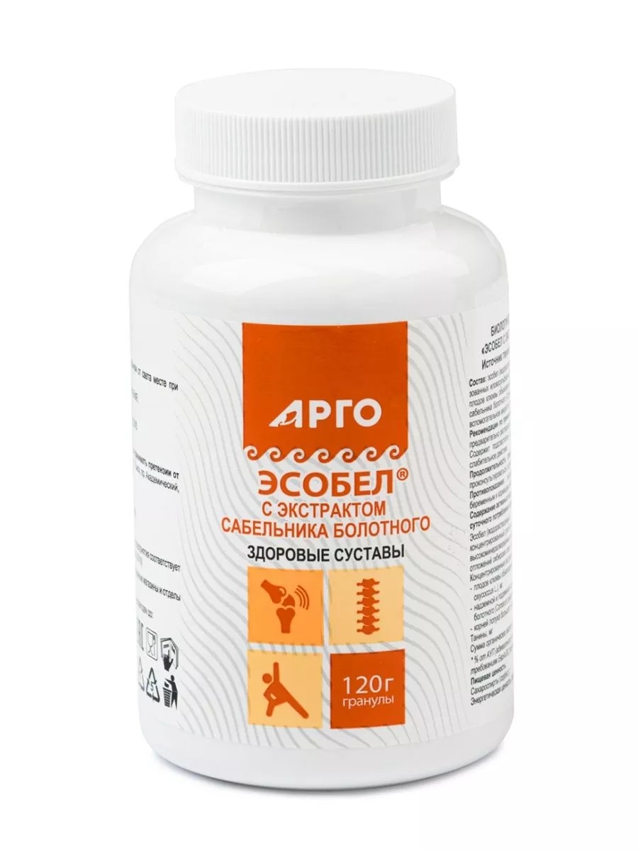 Эсобел с сабельником болотным и экстрактом корня лопуха выпускает ООО Биолит (г. Томск) для Арго. БАД Эсобел - экстракт лечебных грязей высокоминерализованных сибирских озер, содержащий природный комплекс минеральных солей и органических соединений (фульвовые и гуминовые кислоты, аминокислоты, простогландины). Пищевая добавка Эсобел с сабельником болотным Биолит Арго обладает выраженной противовоспалительной активностью (уменьшает болевой синдром, гиперемию), препятствует образованию спаек, вызывает рассасывание уже существующих. Это здоровое питание усиливает регенерацию в очаге воспаления, сохраняет и восстанавливает подвижность суставов. Эти целебные свойства многократно усилены экстрактами сабельника болотного и корня лопуха. Эсобел Биолит Арго рекомендуется для профилактики и усиления медикаментозной терапии: дегенеративных заболеваний опорно-двигательного аппарата (остеохондроз, остеоартроз); воспалительных заболеваний (артриты, бурсит, синовит, тендовагинит); травм (переломы, разрывы, растяжения связок, ушибы, гематомы, вывихи). БАД Эсобел с сабельником болотным и корнем лопуха Биолит Арго для здоровья суставов и здорового питания применяется взрослым по 1 ч. л. гранул, растворенных в 100 мл теплой воды, 3 раза в день во время еды 3-4 недели. Состав пищевой добавки: Эсобел, экстракты ягод клюквы, травы и корней сабельника болотного, корней лопуха; вспомогательные вещества: сорбит.