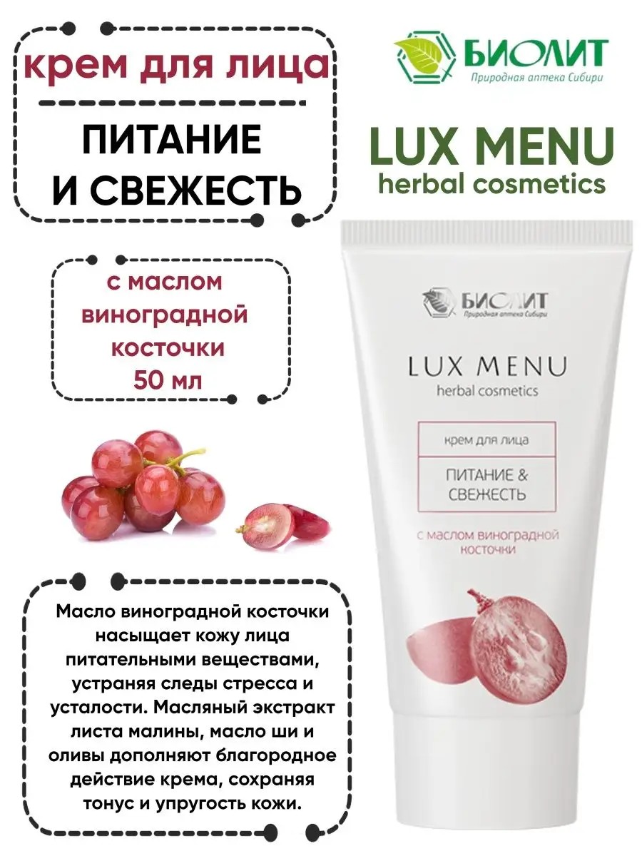 Высокое содержание масляных экстрактов обеспечивает коже необходимое питание и увлажнение. Масло виноградной косточки насыщает кожу лица питательными веществами, устраняя следы стресса и усталости. Масляный экстракт листа малины, масло ши и оливы дополняют благородное действие крема, сохраняя тонус и упругость кожи.