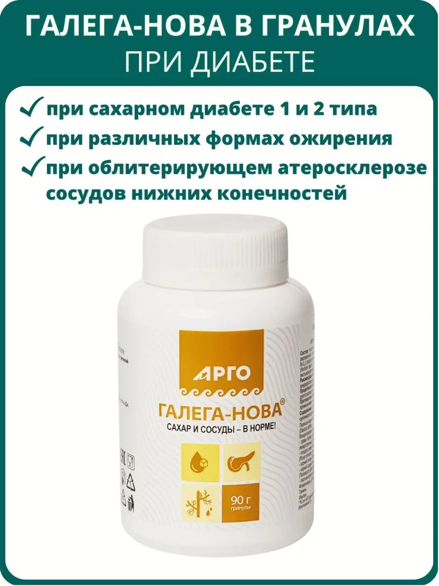 The biologically active food supplement "GalegaNova" has a complex effect on the vascular system, reduces blood glucose and cholesterol levels, exhibits anti-atherosclerotic and vascular strengthening effects, normalizes water-salt, carbohydrate, and fat metabolism, which allows this parapharmaceutical to be used in a number of forms and complications of diabetes.