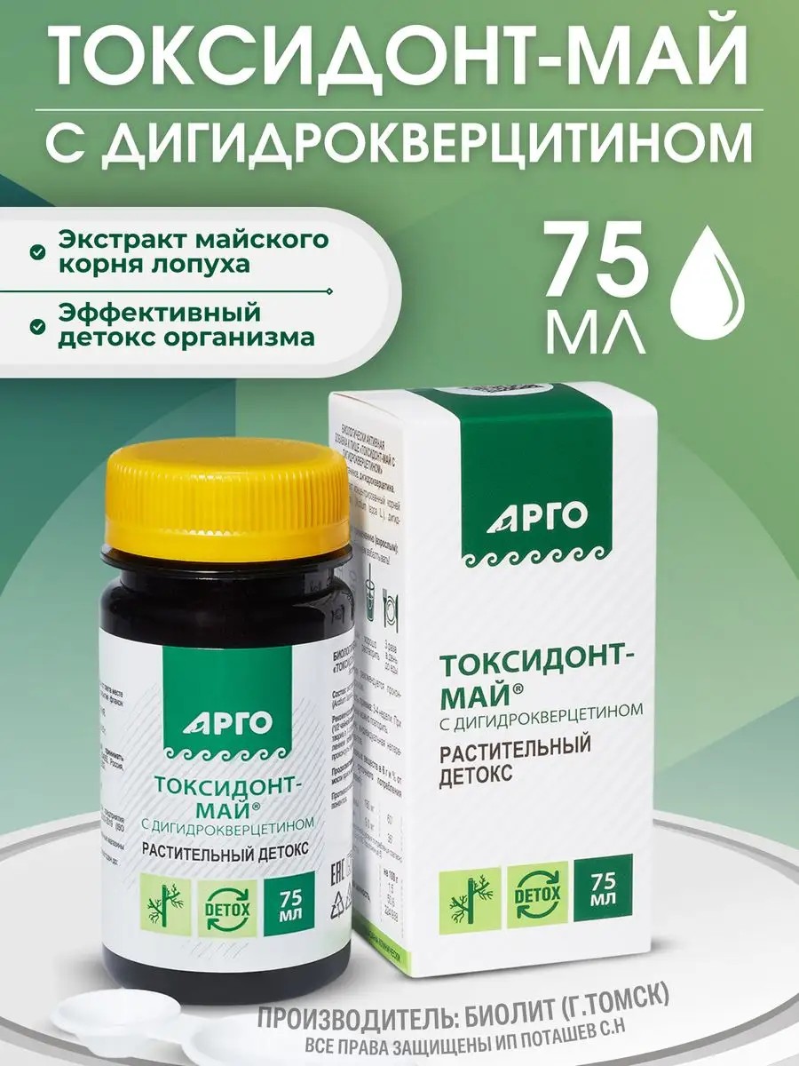 Токсидонт май с дигидрокверцитином - натуральный безопасный продукт, обладающий выраженным антитоксическим, антиоксидантным, лимфодренажным, жаропонижающим, противовоспалительным, бактерицидным, иммуномодулирующим действием. Способствует нормализации водно-солевого, углеводного и жирового обмена. Применяется в качестве антиоксидантного и противотоксического средства: при острых и хронических заболеваниях; применении фармпрепаратов, химиотерапии; при острых и хронических, в том числе алкогольных, интоксикациях; при проживании в зоне экологического неблагополучия; профессии, связанной с химическими вредностями.
