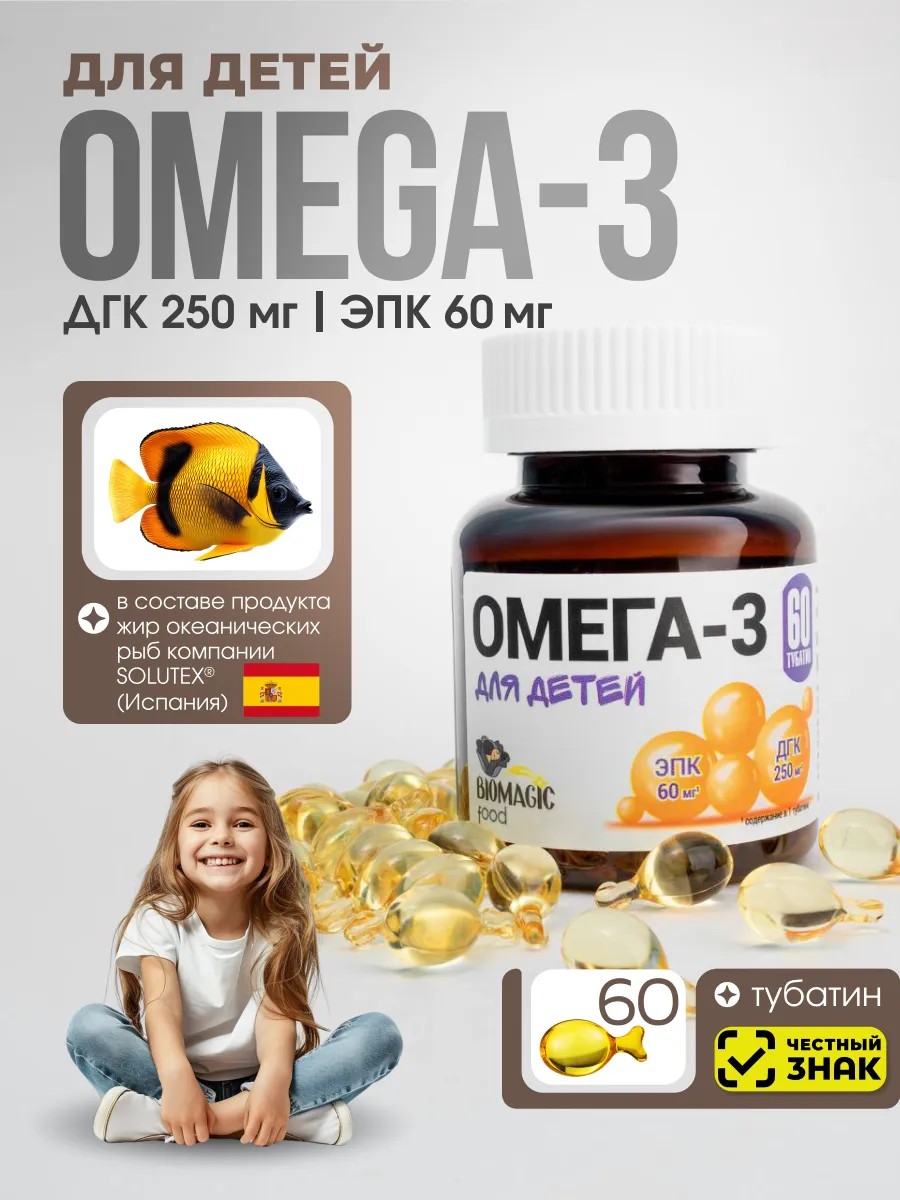Omega-3 for children from BioMagic food is a high-quality complex based on docosahexaenoic (DHA) and eicosapentaenoic (EPA) acids.