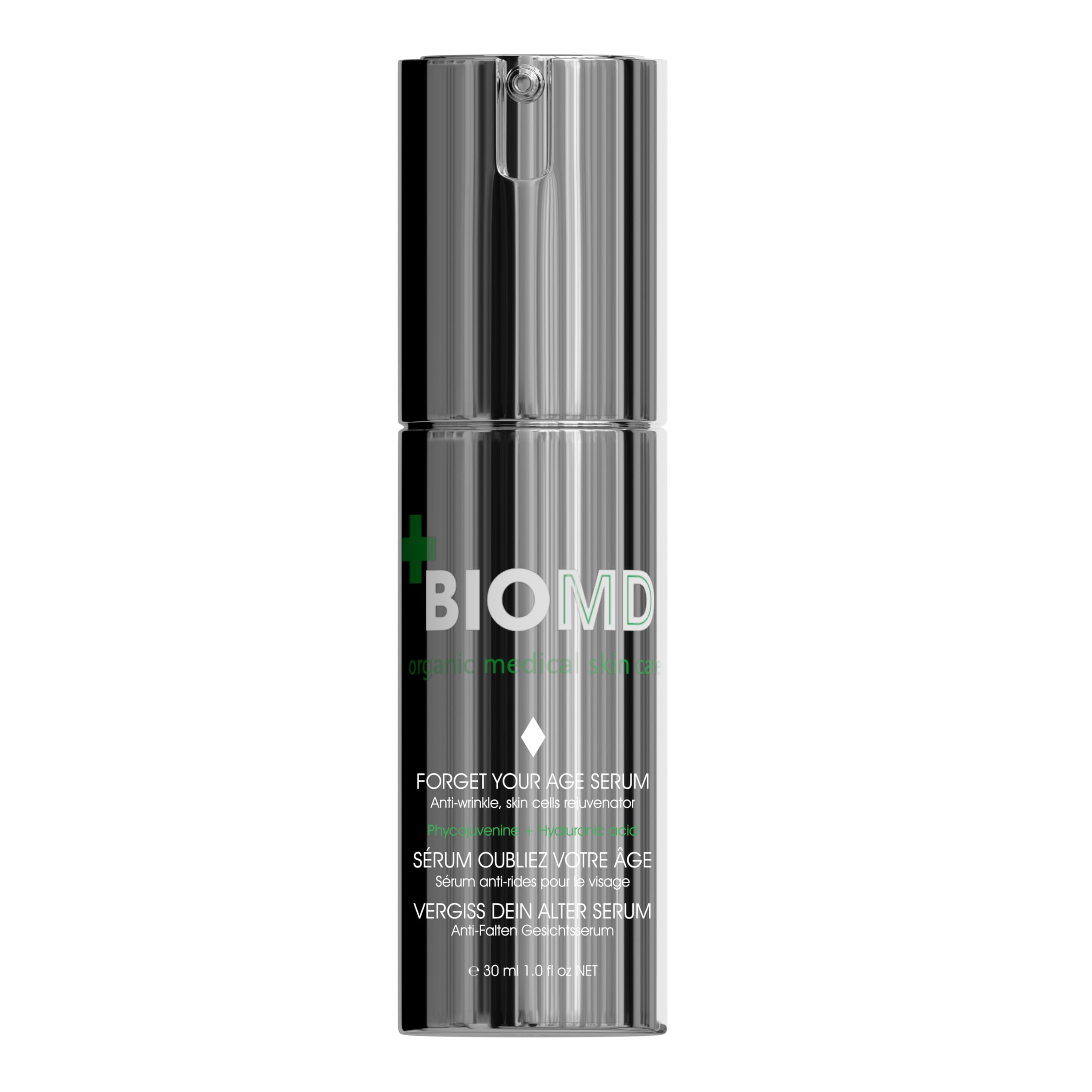 Application: Apply morning and evening, as the first step in your skincare routine, to clean skin (face, neck, and décolleté) with a gentle massage. Follow with your Forget Your Age facial moisturizer. Clinical studies: After 28 days, 80 of participants saw a significant reduction in wrinkles, with a decrease in their depth of up to 29.6 . Natural ingredients: "Aloe vera. Moisturizer: Rich in vitamins B1, B3, B6, and C and 18 amino acids. Possesses naturally healing and anti-wrinkle properties. Moisturizer: Rich in vitamins B1, B3, B6, and C and 18 amino acids. Aloe vera penetrates deep into the skin layers, releg its components and moisturizing it. It refreshes and soothes the skin and prevents irritation. Aloe vera has a moisturizing, healing, and anti-aging effect." Effect. Benefits: "1. Revitalizes skin cells – visibly younger-looking skin up to 95 2. Protects skin cells against aging – prolongs their effectiveness 3. Rejuvenates fibroblasts Stimulates collagen synthesis up to 150 4. Rejuvenates fibroblasts." Key ingredient: "Phycojuvenine Hyaluronic Acid." Solution: Anti-wrinkle effect, stem cell rejuvenation.Sérum BioMD Oubliez votre âge, Forget Your Age, 30 ml, Hyaluron Activ B3, anti-âge, rides, Lift activ, Remplissage à l'acide hyaluronique.Application : Appliquez matin et soir, en première étape de votre routine de soin, sur une peau propre (visage, cou et décolleté) en massant délicatement. Appliquez ensuite votre crème hydratante visage Forget Your Age. Études cliniques : Après 28 jours, 80 des participants ont constaté une réduction significative des rides, avec une diminution de leur profondeur allant jusqu'à 29,6 . Ingrédients naturels : « Aloe vera. Hydratant : riche en vitamines B1, B3, B6 et C et en 18 acides aminés. Possède des propriétés naturellement cicatrisantes et anti-rides. Hydratant : riche en vitamines B1, B3, B6 et C et en 18 acides aminés. L'aloe vera pénètre profondément dans les couches de la peau, libérant ses composants et l'hydratant. Il rafraîchit et apaise la peau et prévient les irritations. L'aloe vera a un effet hydratant, cicatrisant et anti-âge. » Effet. Bienfaits : « 1. Revitalisation des cellules cutanées – peau visiblement plus jeune jusqu'à 95 2. Protection des cellules cutanées contre le vieillissement – prolonge leur efficacité 3. Rajeunissement des fibroblastes Stimulation de la synthèse de collagène jusqu'à 150 4. Rajeunissement des fibroblastes ». Ingrédient clé : « Phycojuvenine Acide hyaluronique ». Solution : Effet anti-rides, rajeunissement par cellules souches.
