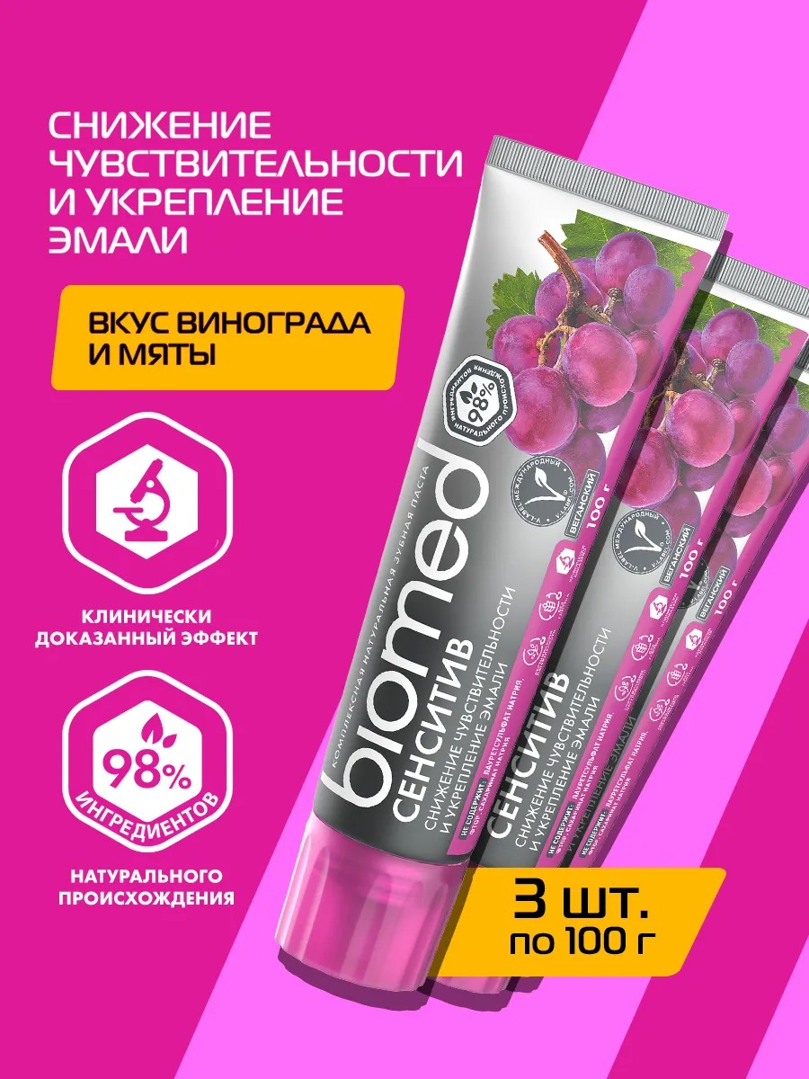 Restorative natural toothpaste for strengthening enamel and reducing sensitivity without fluoride BIOMED SENSITIVE Grape (100 ml, 3 pcs.) saturates enamel with natural calcium, strengthens and reduces tooth sensitivity.