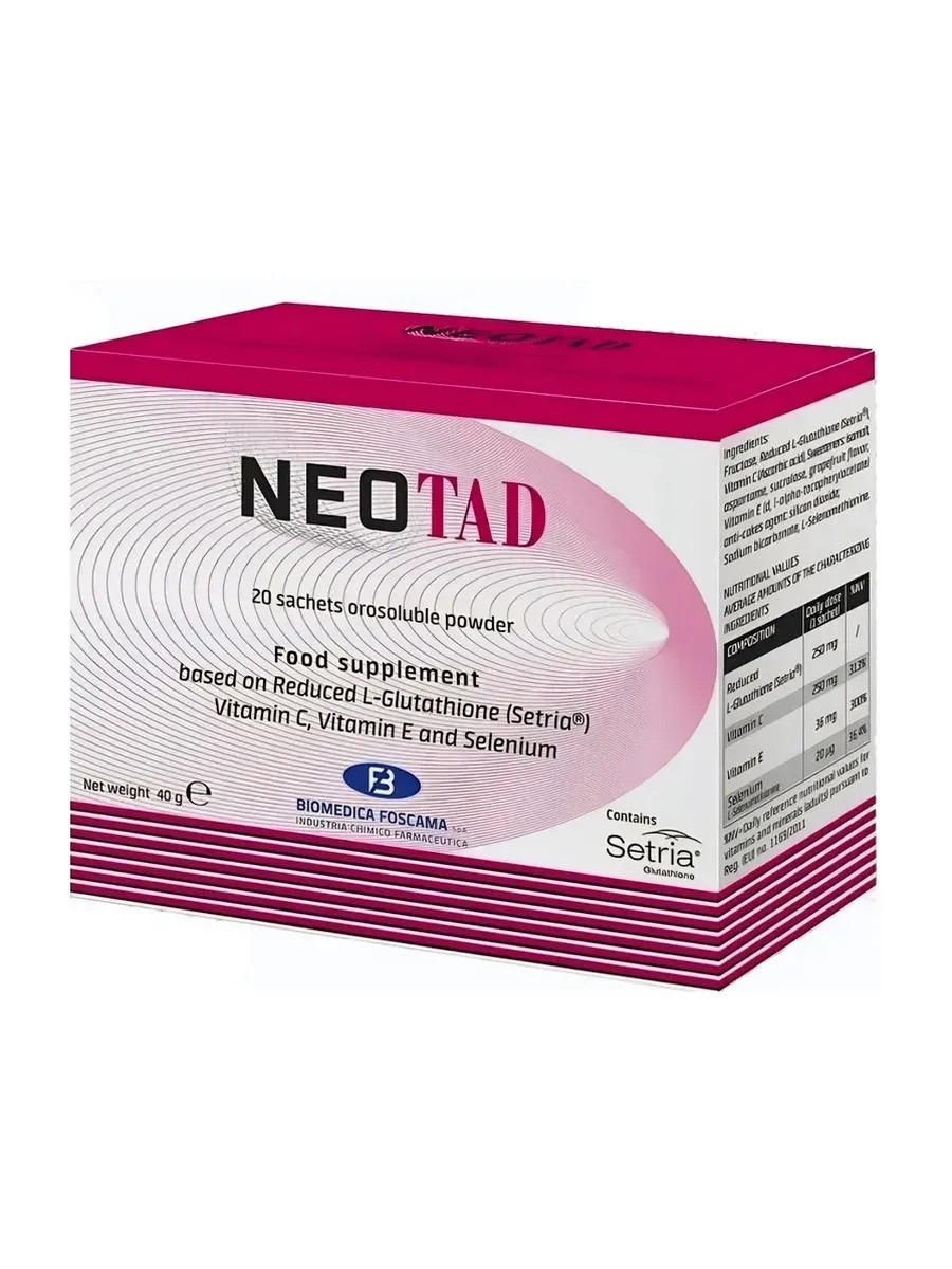 Глутатион Неотад NEOTAD порошок в саше пакетиках по 2гр 20шт - инновационный БАД от BIOMEDICA FOSCAMA, содержащий комбинацию редуцированного глутатиона, витаминов С и Е, а также селена. Выпускается в виде порошка в саше по 2 г.