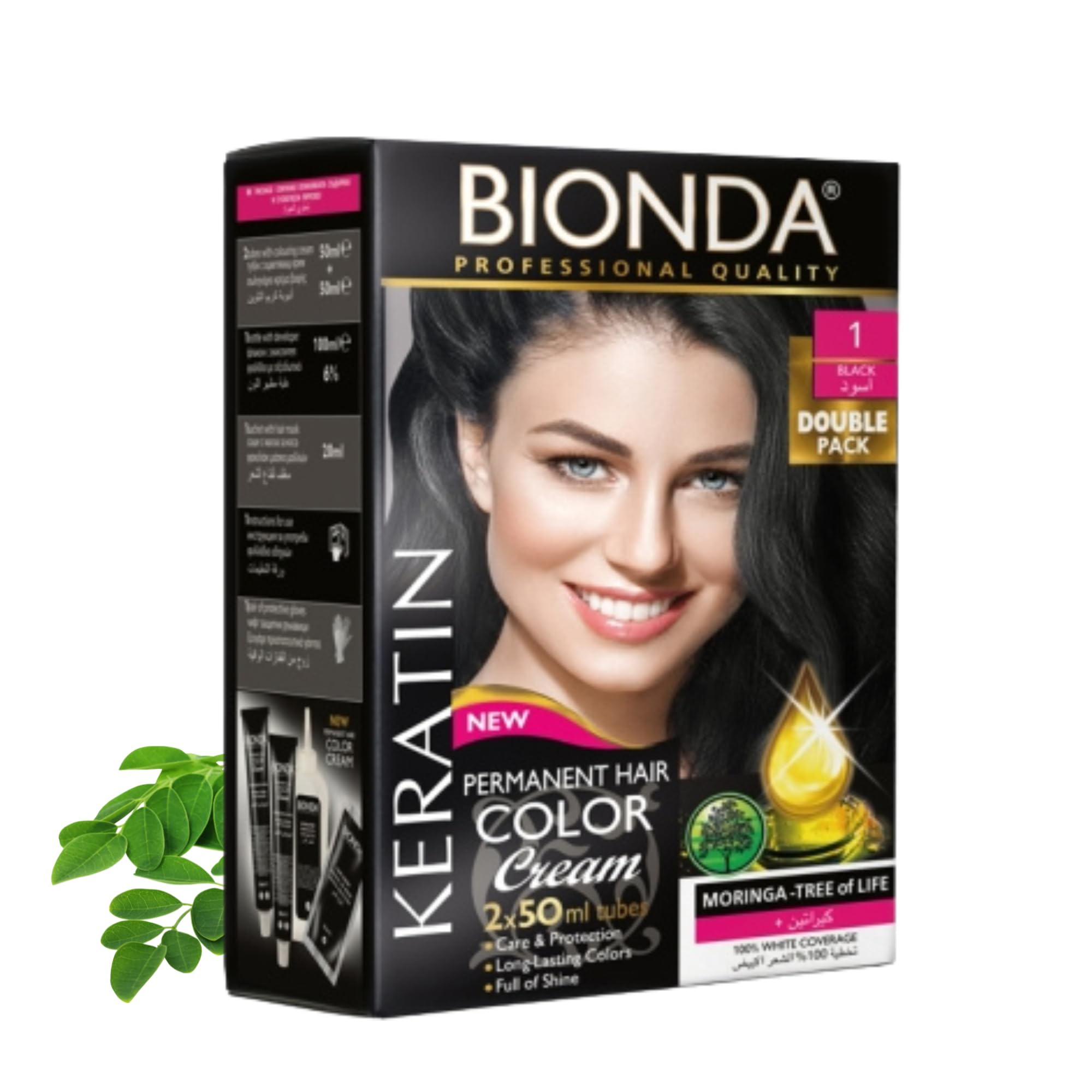 BIONDA Professional stands for salon-ready results at home. This permanent cream color in a practical double pack delivers intense, even color results and reliable gray coverage, combined with a nourishing formula with keratin and moringa. Each pack contains everything you need for home use: 2 tubes of color (2 x 50 ml), 1 developer (100 ml, 6 ), 1 conditioning mask (20 ml), gloves, and instructions. The creamy texture distributes evenly from root to tip, leaving a glossy finish. Benefit Value – The double pack with two color tubes allows you to plan your routine as you wish: dye once all over or save the second tube for a root refresh. This way, the desired shade remains visible and you can use the color whenever it suits your daily routine – a plus in flexibility and value for money. Caring formula with keratin and moringa: The formula promotes a supple hair feel and visible shine. Keratin smooths the hair surface for a cared-for appearance. Moringa completes the care routine. The result is a permanent hair color with a balance of intensity, shine, and care. Features at a glance: Permanent hair color with 100 gray coverage. Even, intense color with a glossy finish. Double pack (2 x 50 ml) for full use or subsequent coloring. Contains developer (100 ml, 6 ), conditioning mask (20 ml), gloves, and instructions (may not be available in Dutch). Suitable for various hair types: from fine to strong, short to long. Creamy texture for controlled application ideal for home use. Use: Step-by-step allergy skin test: Perform 48 hours before each use according to the instructions. Preparation: Wrap in a towel and put on gloves. Mix the color and developer until a smooth color cream is formed. Application: Distribute through dry, unwashed hair from the roots to the lengths. Development time: Leave on according to the instructions. Rinse and condition: Rinse thoroughly, then apply the conditioning mask, leave on briefly, rinse, and style. Suitable for those seeking reliable, long-lasting hair color with a professional look, whether for a complete hair change, to cover gray hair, or to refresh the current shade. The color is suitable for various hair textures (fine, normal, and strong) and hair lengths. Ingredients with added value (without healing promises): Keratin contributes to a smooth and conditioned surface and gives the hair a neat look. Moringa oil extract is known for its nourishing properties and supports a supple hair feel. When combined, the color cream combines color brilliance and conditioning. Tips for the best possible result: Choose a shade that matches the original color if in doubt, try a lighter shade first. Section the hair and work strand by strand to ensure even results. After coloring, use a color-protecting shampoo and conditioner use moderate heat styling. For a fresh result, refresh the roots in between with the second tube. CROSS-SELL Ideas for a complete routine combine color protection care and regularly schedule a care mask – this maintains suppleness and enhances the color's radiance. Safety instructions: Follow the instructions on the box and leaflet. Hair color may cause allergic reactions. Not suitable for persons under 16 years of age. Avoid contact with eyes, wear suitable gloves, and strictly follow the instructions for use. Hair dye hair color coloring cream color cream permanent hair color long-lasting hair color intensive color cream gray hair coverage gray hair coverage double pack 2 x 50 ml keratin hair dye moringa care shine hair color hair dye set developer conditioner care mask easy to use at home long-lasting color coverage roots coloring post-color protection color care color cream treatment gloves instructions SAFETY WARNING: Hair dye may cause allergic reactions. Perform a skin allergy test 48 hours before each use and follow the instructions. Not suitable for persons under 16 years of age. Avoid contact with eyes. Do not use on eyelashes or eyebrows. Wear suitable gloves.Shine and color brilliance: the tailored formula ensures vibrant, intense color results, noticeable shine. For anyone who wants permanent hair color with a professional look, reliable coverage and a well-groomed appearance. Added value through double packaging: two paint tubes offer flexibility – paint completely or refresh the attachments. This way the desired color remains visible. EASY TO USE: Creamy texture for precise application without drips. The Color Cream distributes evenly from roots to ends and is suitable for different hair types, including natural and gray hair. Complete set: contains 2 tubes of color (2 x 50 ml), 1 developer (100 ml, 6 ), 1 care mask (20 ml), gloves and instructions. Simply mix, apply, leave in and rinse for professional results at home. Keratin Moringa care: the formula with keratin and moringa supports supple hair feeling and visible shine during coloring. Gently cares for the hair fibers for a well-groomed finish - without weighing it down, easy to rinse. Intensive color covering power: permanent cream coloring with rich, even shade and up to 100 gray hair coverage. The double pack (2 x 50 ml) is suitable for a complete application or a later refresh at home.BIONDA Professionele permanente haarkleur Color Cream 1 zwart 200ml dubbelverpakking keratine moringa verzorging langdurige, intense kleur met glans 100 grijze haardekking BIONDA Professional staat voor salonrijpe resultaten thuis. Deze permanente crèmekleuring in een praktische dubbelverpakking levert intensieve, gelijkmatige kleurresultaten en betrouwbare dekking van grijs haar, gecombineerd met een voedende formule met keratine en moringa. Elke verpakking bevat alles wat je nodig hebt voor thuisgebruik: 2 tubes kleur (2 x 50 ml), 1 ontwikkelaar (100 ml, 6 ), 1 verzorgingsmasker (20 ml), handschoenen en instructies. De romige textuur verdeelt zich gelijkmatig van de aanzet tot in de punten en zorgt voor een glanzende afwerking. Voordeel waarde – dubbele verpakking met twee verftubes