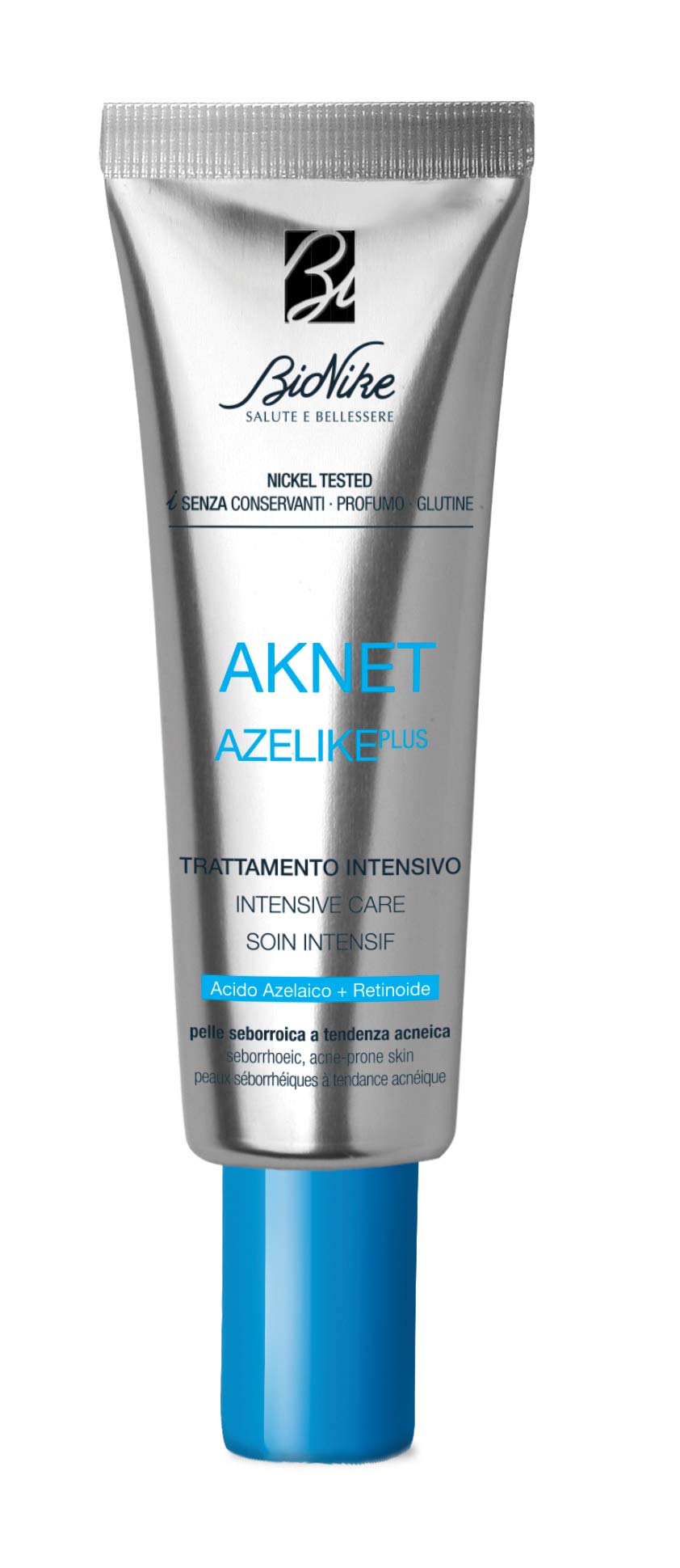 Huidverzorgingsproduct in zilveren tube met blauwe dop. Op het etiket staan 'AKNET' en 'AZELAINE', wat duidt op een behandeling op basis van azelaïnezuur voor een
