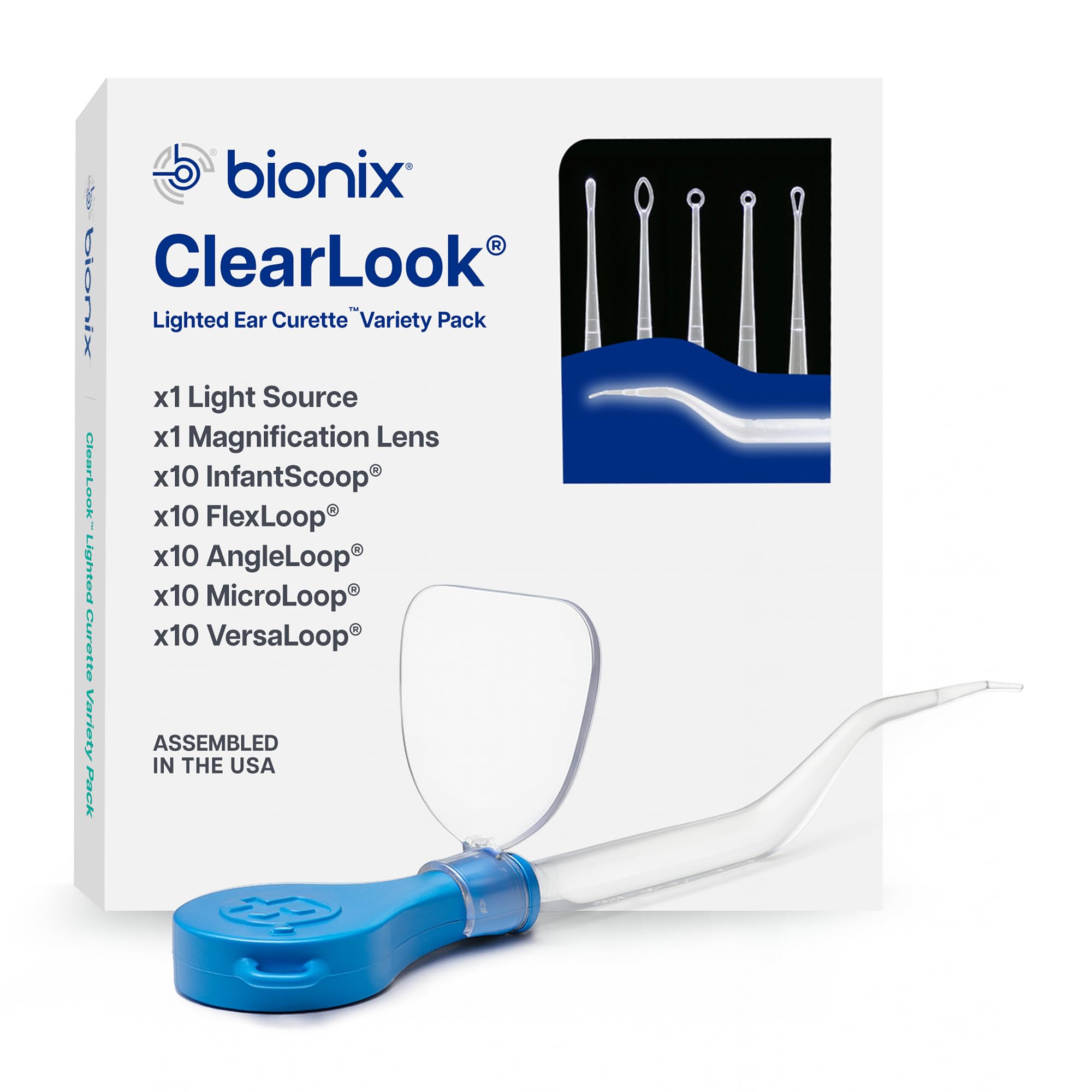 WHO WE SERVE: Bionix provides quality healthcare products that are designed for all medical professionals, from pediatricians to home healthcare specialists to help better the lives of patients in every developmental stage. - Made in America -. EASY-TO-USE: Bionix offers four other tip styles to meet specific needs, giving you the right tool for any cerumen situation. All curettes are single-use to prevent contamination, eliminating the need for "three hands" can shorten procedure time. ACCURATE: These curettes offer enhanced visibility on earwax removal, which is typically a blind procedure. They also have a unique handle design that promotes a natural comfortable grip, ensuring the holding finger is outside the line of sight. FLEXIBLE STRONG: Stainless steel curettes can damage the ear canal tympanic membrane. ClearLook Lighted Ear Curettes, complete with reference markers, are flexible to reduce injury, making them a safe and comfortable alternative. INCLUDED IN THIS KIT: The box of 50 curettes contains 10 each of the ClearLook Lighted AngleLoop, MicroLoop, VersaLoop, FlexLoop, InfantScoop. Also included in this set is a Light Source a Magnification Lens.
