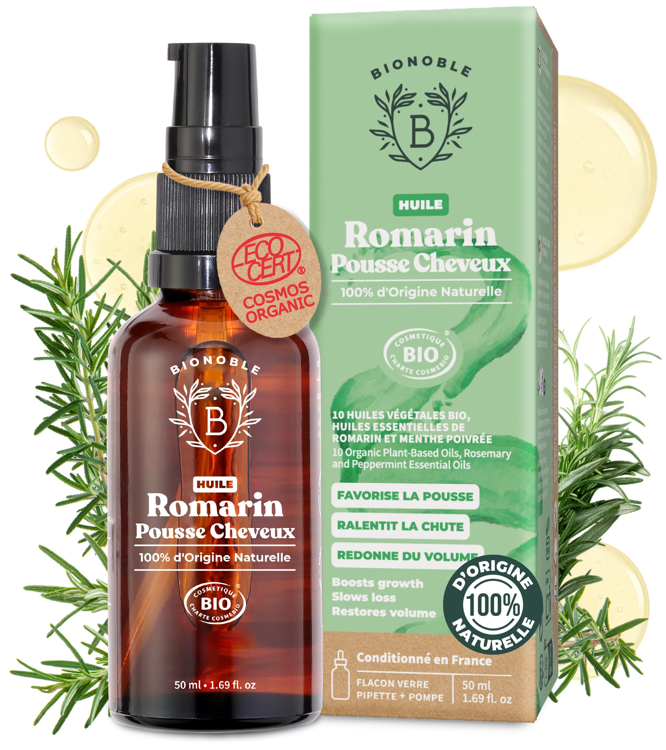 ORGANIC, VEGAN, AND 100 NATURAL - Recyclable amber glass bottle with accessories included. Rosemary hair oil, packaged in France, vegan hair growth oil with rosemary essential oil, hexane-free. 100 natural origin and certified organic by Ecocert. LIGHT AND NON-GREASY TEXTURE - A fluid formula that absorbs easily without weighing hair down. This hair growth oil can be used as a hair oil treatment, scalp massage, or finishing serum. MULTI-PURPOSE HAIR AND BEARD CARE - Our rosemary oil is suitable for all hair types and beards. Used as a beard oil, it deeply nourishes, tames unruly hair, and naturally restores density. SLOWS HAIR LOSS - Enriched with rosemary and peppermint essential oils, this rosemary hair serum revitalizes roots, tones and nourishes the scalp, and reduces hair loss. VISIBLY PROMOTES GROWTH - Our hair growth oil, combining 10 organic plant oils and rosemary essential oil, stimulates scalp circulation and activates hair growth.BIONOBLE Huile de Romarin pour Cheveux Bio - Favorise la Pousse et Ralentit la Chute - Huile Romarin Cheveux, Ricin, Argan, Jojoba - Rosemary Oil for Hair Growth - Flacon Verre, Pipette, Pompe - 50ml Romarin 50 ml (Lot de 1)BIO, VEGAN ET 100 D'ORIGINE NATURELLE - Flacon en verre ambré recyclable avec accessoires inclus. Huile de romarin cheveux conditionnée en France, vegan hair growth oil with rosemary essential oil, sans hexane. 100 d'origine naturelle et certifiée Bio par Ecocert. TEXTURE LÉGÈRE ET NON GRASSE - Une formule fluide qui pénètre facilement sans alourdir. Cette huile pousse cheveux est à utiliser en bain d'huile, massage du cuir chevelu ou en sérum de finition. SOIN MULTI-USAGES CHEVEUX ET BARBE - Notre huile romarin est adaptée à tous les types de cheveux et à la barbe. Utilisée comme huile de romarin barbe, elle nourrit en profondeur, discipline et redonne de la densité naturellement. RALENTIT LA CHUTE DES CHEVEUX - Enrichi en huile essentielle de romarin et menthe poivrée, ce serum de romarin pour cheveux revitalise les racines, tonifie et nourrit le cuir chevelu et limite la chute des cheveux. FAVORISE VISIBLEMENT LA POUSSE - Notre huile pousse cheveux associant 10 huiles végétales bio et huile essentielle romarin, stimule la circulation du cuir chevelu et active la croissance capillaire.