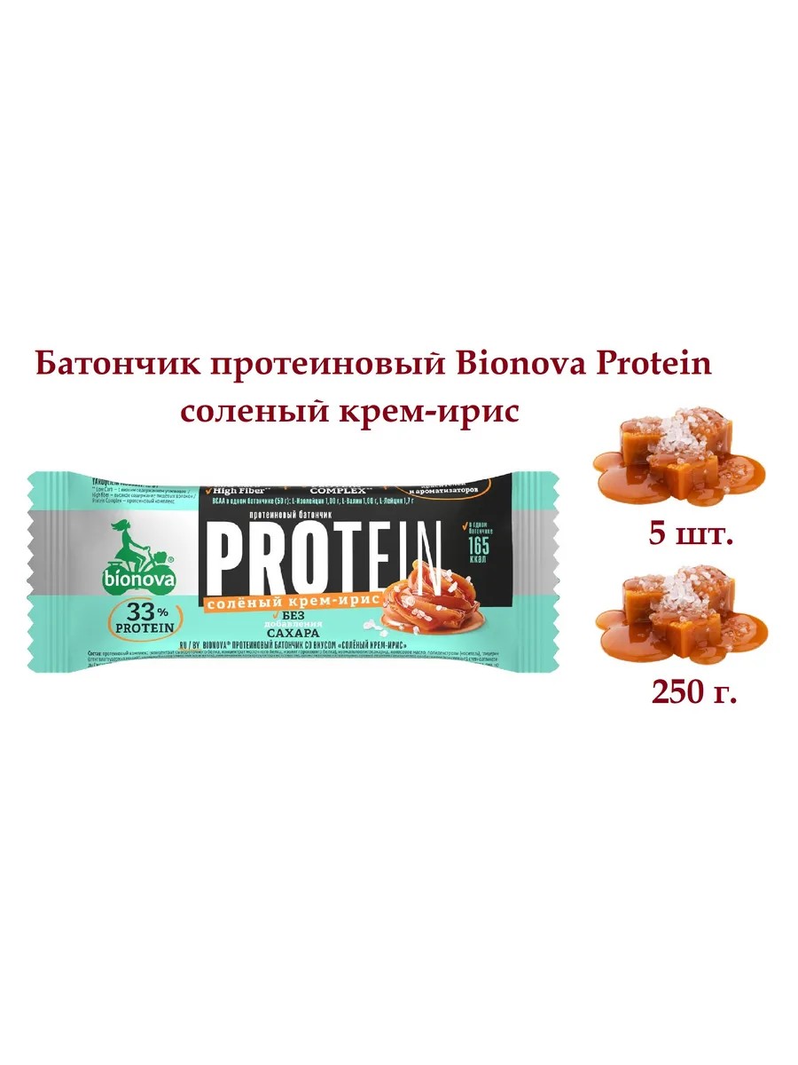 Полное наименование товараБатончик протеиновый Bionova Protein соленый крем-ирис