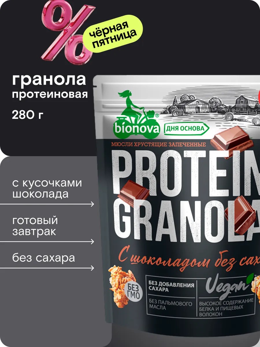 Bionova Шоколадная гранола без сахара с протеином, 280 г